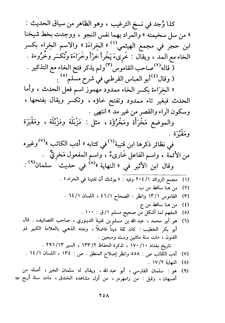 كذا وُجد في نسخ الترغيب، وهو الظاهر من سياق الحديث: "من سل سخيمته" والمراد بهما نفس النجو، ووجدت بخط شيخنا ابن حجر في مجمع الهيثمي "الخِراءَة" والاسم الخِراء بكسر الخاء مع المد، ويقال: خَرِىءَ يَخْرأ خرْأ وخَرَاءَة وتُكسَر وخُرُوءة.