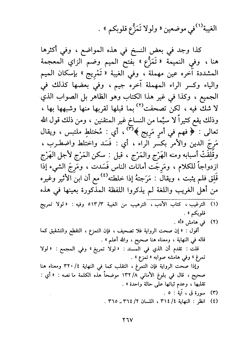 كذا وجد في بعض النسخ في هذه المواضع، وفي أكثرها هنا، وفي النميمة "تَمَزُّع" بفتح الميم وضم الزاي المعجمة المشددة آخره عين مهملة، وفي الغيبة "تَمْرِيج" بإسكان الميم والياء وكسر الراء المهملة آخره جيم، وفي بعضها كذلك في الجميع، وكذا في غير هذا الكتاب وهو الظاهر بل الصواب الذي لا شك فيه، لكن تصحفت بما قبلها لقربها منها وشبهها بها، وذلك يقع كثيراً لا سيَّما من النساخ غير المتقنين، ومن ذلك قول الله تعالى: {فَهُمْ فِي أَمْرٍ مَرِيجٍ}، أي: مُختلطِ ملتبس، ويقال مَرجَ الدين والأمر بكسر الراء، أي: فَسَد واختلط واضطرب، وقلِقَتْ أسبابه ومنه الهَرْج والمَرْج، قيل: سكن المَرْج لأجل الهَرْج ازدواجاً للكلام، ومَرِجَت أمانات الناس فَسَدت، ومَرِجَ الشيء إذا قَلِق فلم يثبت، ويقال: مَرَجتهُ إذا خلطته مع أن ابن الأثير وغيره من أهل الغريب واللغة لم يذكروا اللفظة المذكورة بعينها في هذه