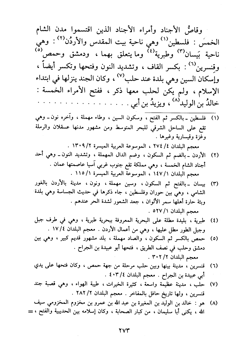 وقاصُّ الأجناد وأمراء الأجناد الذين اقتسموا مدن الشام الخمس: فلسطين وهي ناحية بيت المقدس والأردُن: وهي ناحية بَيسان وطبرية وما يتعلق بهما، ودمشق وحمص وقِنسرين: بكسر القاف، وتشديد النون وفتحها وتكسر أيضاً، وإسكان السين وهي بلدة عند حلب، وكان الجند ينزلها في ابتداء الإسلام، ولم يكن لحلب معها ذكر، ففتح الأمراء الخمسة: خالدُ بن الوليد، ويزيدُ بن أبي