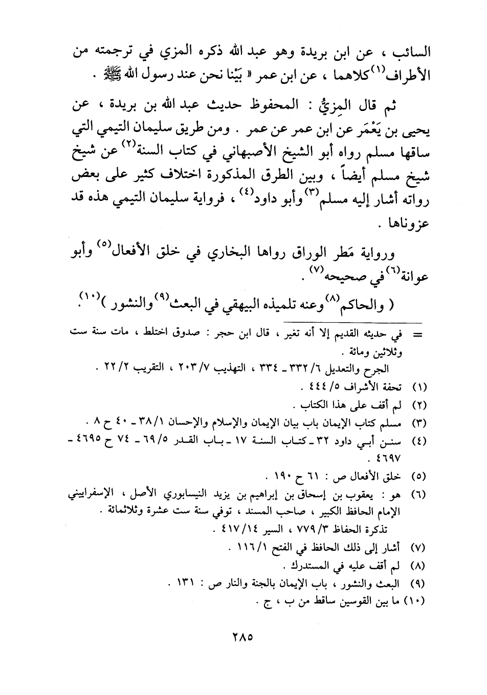 ثم قال المِزيُّ: المحفوظ حديث عبد الله بن بريدة، عن يحيى بن يَعْمَر عن ابن عمر عن عمر. ومن طريق سليمان التيمي التي ساقها مسلم رواه أبو الشيخ الأصبهاني في كتاب السنة عن شيخ شيخ مسلم أيضاً، وبين الطرق المذكورة اختلاف كثير على بعض رواته أشار إليه مسلم وأبو داود، فرواية سليمان التيمي هذه قد عزوناها.
