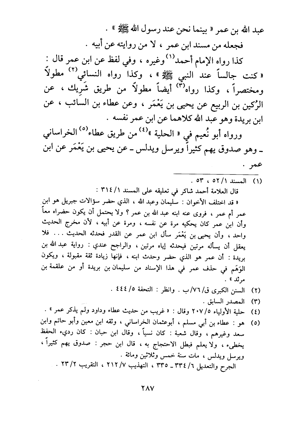 كذا رواه الإمام أحمد وغيره، وفي لفظ عن ابن عمر قال: "كنت جالساً عند النبي - صلى الله عليه وسلم -", وكذا رواه النسائي مطولاً ومختصراً، وكذا رواه أيضاً مطولاً من طريق شَرِيك، عن الرُكين بن الربيع عن يحيى بن يَعْمَر، وعن عطاء بن السائب، عن ابن بريدة وهو عبد الله كلاهما عن ابن عمر نفسه.