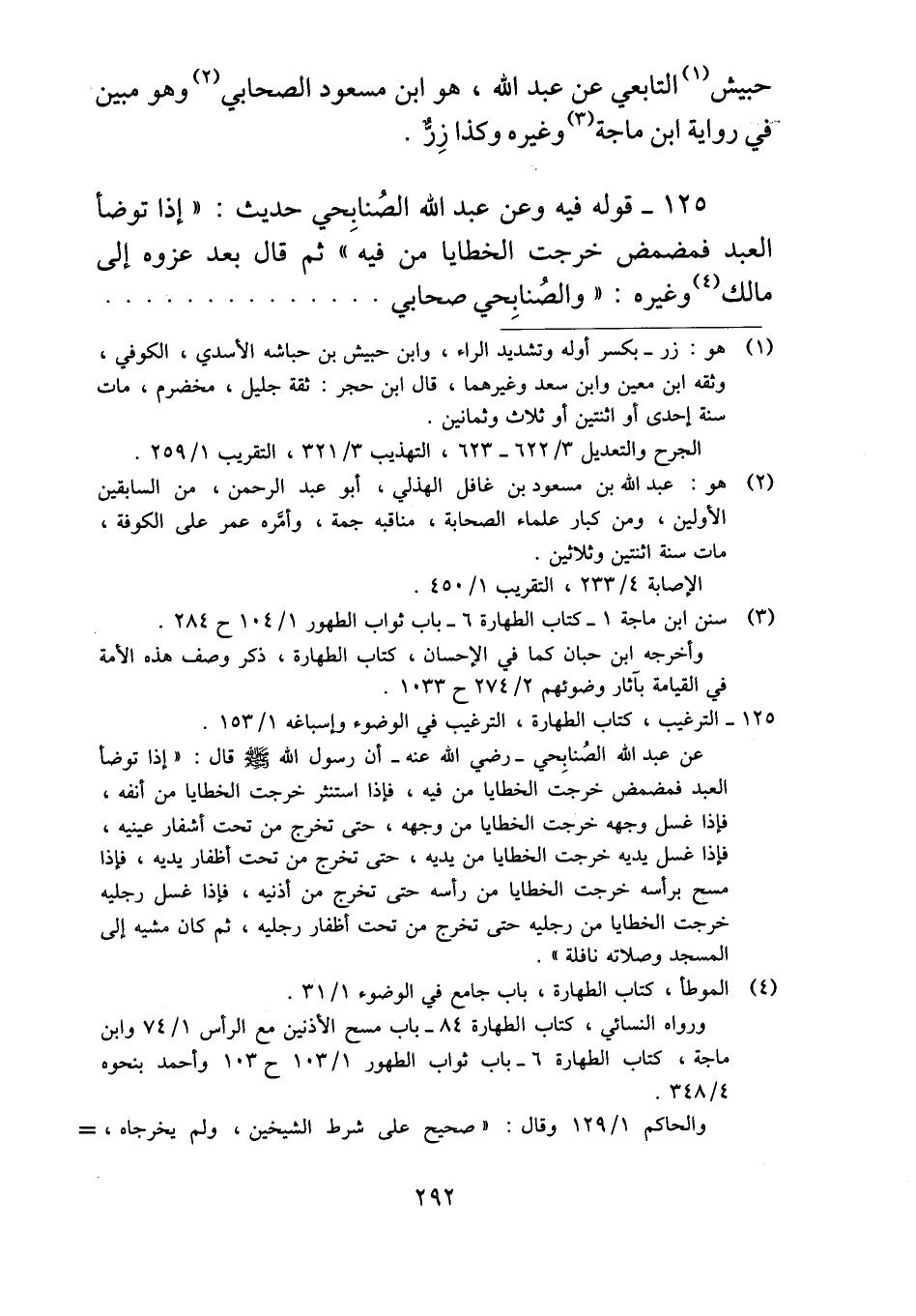 ١٢٥ - قوله فيه وعن عبد الله الصُنابِحي حديث: "إذا توضأ العبد فمضمض خرجت الخطايا من فيه" ثم قال بعد عزوه إلى مالك وغيره: "والصُنابِحي صحابي