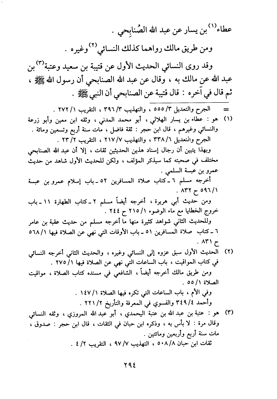 وقد روى النسائي الحديث الأول عن قتيبة بن سعيد وعتبة بن عبد الله عن مالك به، وقال عن عبد الله الصنابحي أن رسول الله - صلى الله عليه وسلم -، ثم قال في آخره: قال قتيبة عن الصنابحي أن النبي - صلى الله عليه وسلم -.