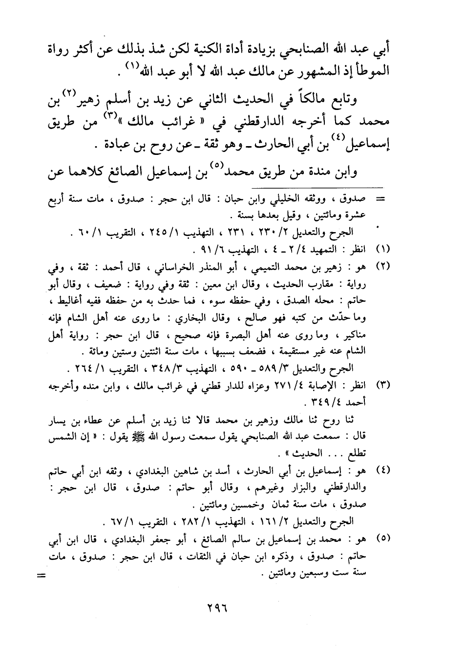 وتابع مالكاً في الحديث الثاني عن زيد بن أسلم زهير بن محمد كما أخرجه الدارقطني في "غرائب مالك" من طريق إسماعيل بن أبي الحارث -وهو ثقة- عن روح بن عبادة.