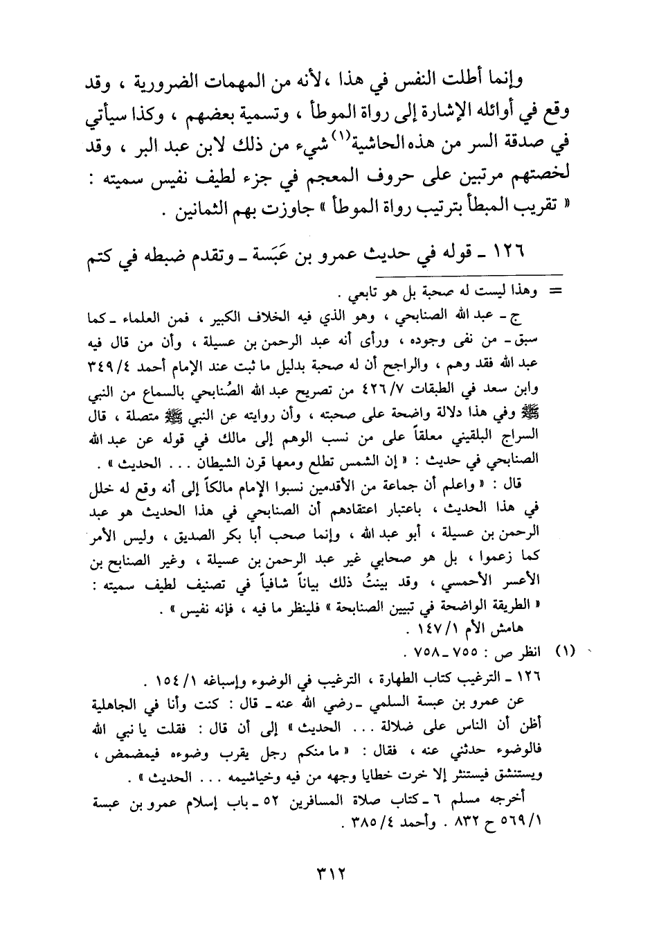 وإنما أطلت النفس في هذا، لأنه من المهمات الضرورية، وقد وقع في أوائله الإشارة إلى رواة الموطأ، وتسمية بعضهم، وكذا سيأتي في صدقة السر من هذه الحاشية شيء من ذلك لابن عبد البر، وقد لخصتهم مرتبين على حروف المعجم في جزء لطيف نفيس سميته: "تقريب المبطأ بترتيب رواة الموطأ" جاوزت بهم الثمانين.