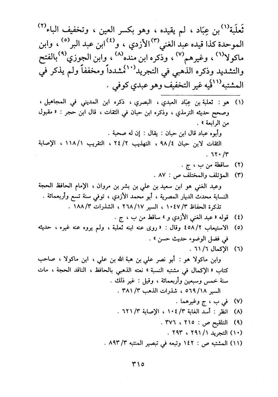 ثَعلَبة بن عِبَاد، لم يقيده، وهو بكسر العين، وتخفيف الباء الموحدة كذا قيده عبد الغني الأزدي، وابن عبد البر، وابن ماكولا، وغيرهم، وذكره ابن منده، وابن الجوزي بالفتح والتشديد وذكره الذهبي في التجريد مشدداً ومخففاً ولم يذكر في المشتبه فيه غير التخفيف وهو عبدي كوفي.