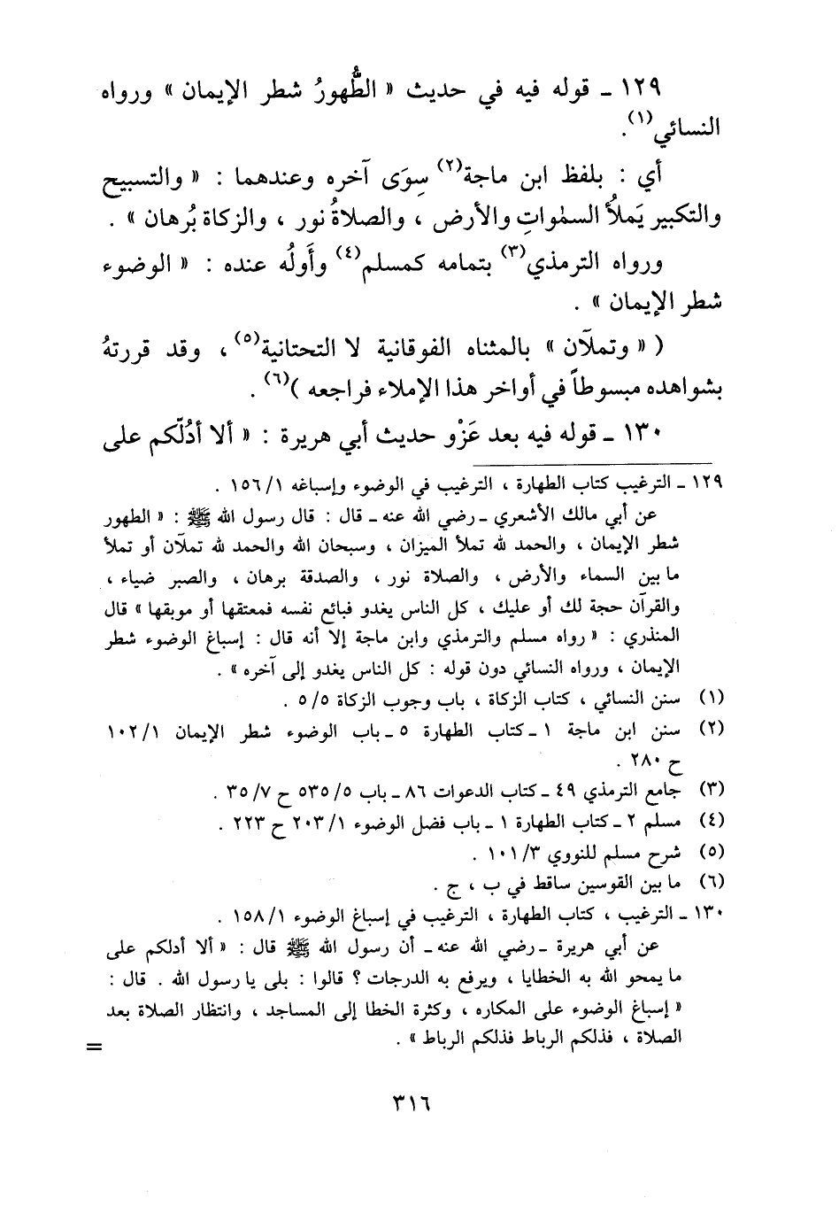١٢٩ - قوله فيه في حديث "الطُّهورُ شطر الإيمان" ورواه النسائي.