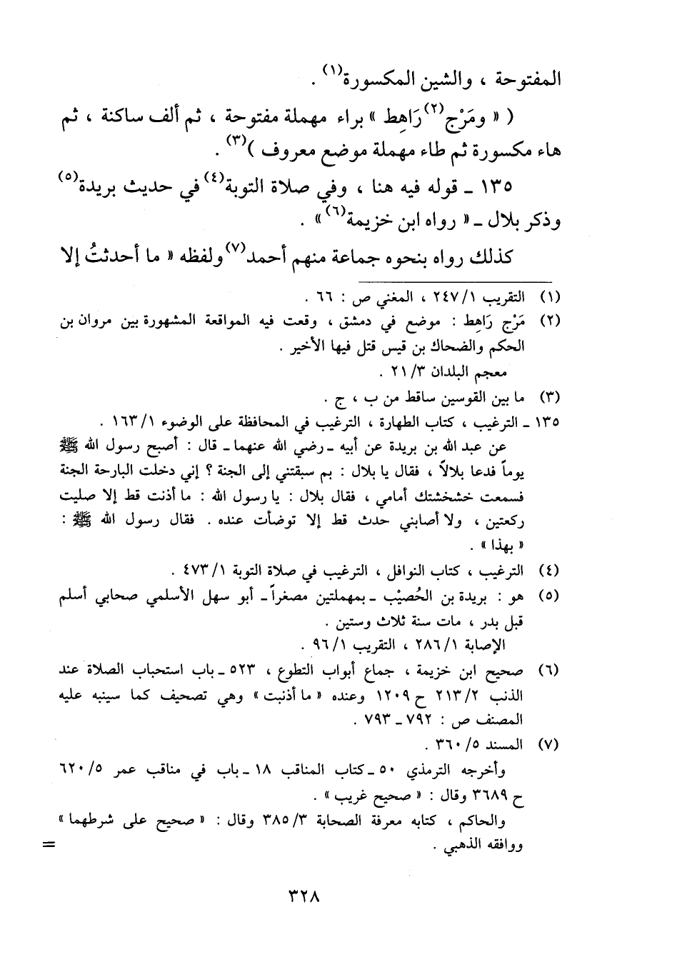 ١٣٥ - قوله فيه هنا، وفي صلاة التوبة في حديث بريدة وذكر بلال- "رواه ابن خزيمة".