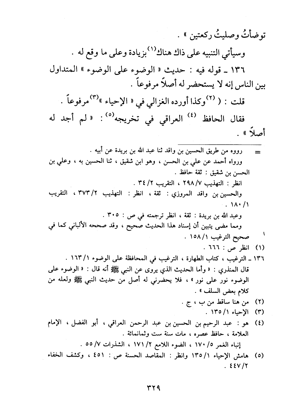 ١٣٦ - قوله فيه: حديث "الوضوء على الوضوء" المتداول بين الناس إنه لا يستحضر له أصلاً مرفوعاً.