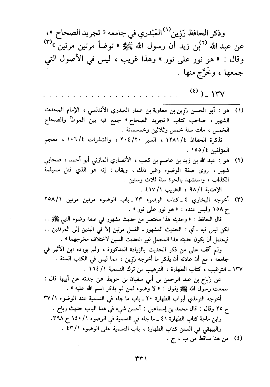 وذكر الحافظ رَزِين العَبْدري في جامعه "تجريد الصحاح"، عن عبد الله بن زيد أن رسول الله -صلى الله عليه وسلم- "توضأ مرتين مرتين" وقال: "هو نور على نور" وهذا غريب، ليس في الأصول التي جمعها، وخرَّج منها.