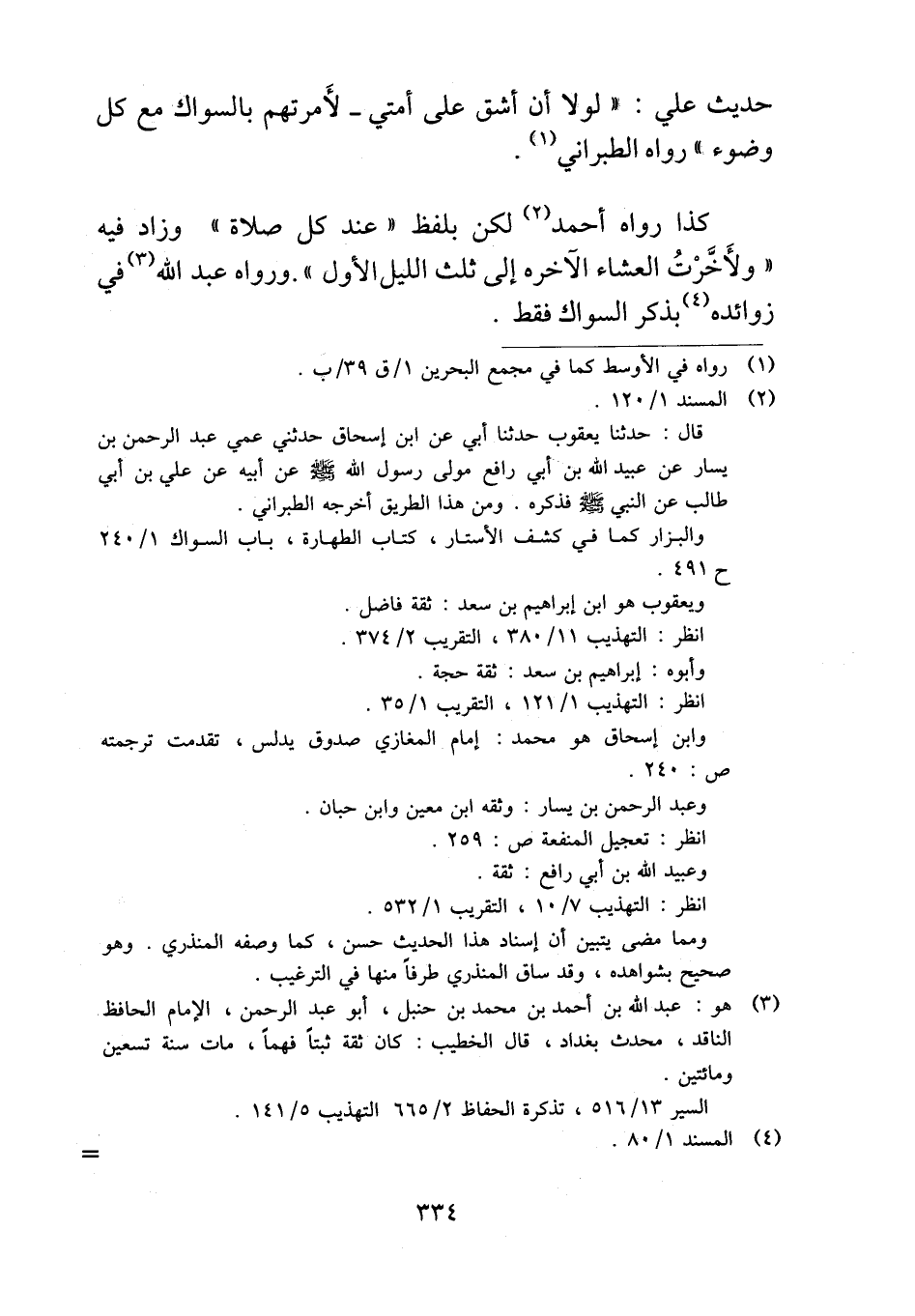 حديث علي: "لولا أن أشق على أمتي -لأَمرتهم بالسواك مع كل وضوء" رواه الطبراني.