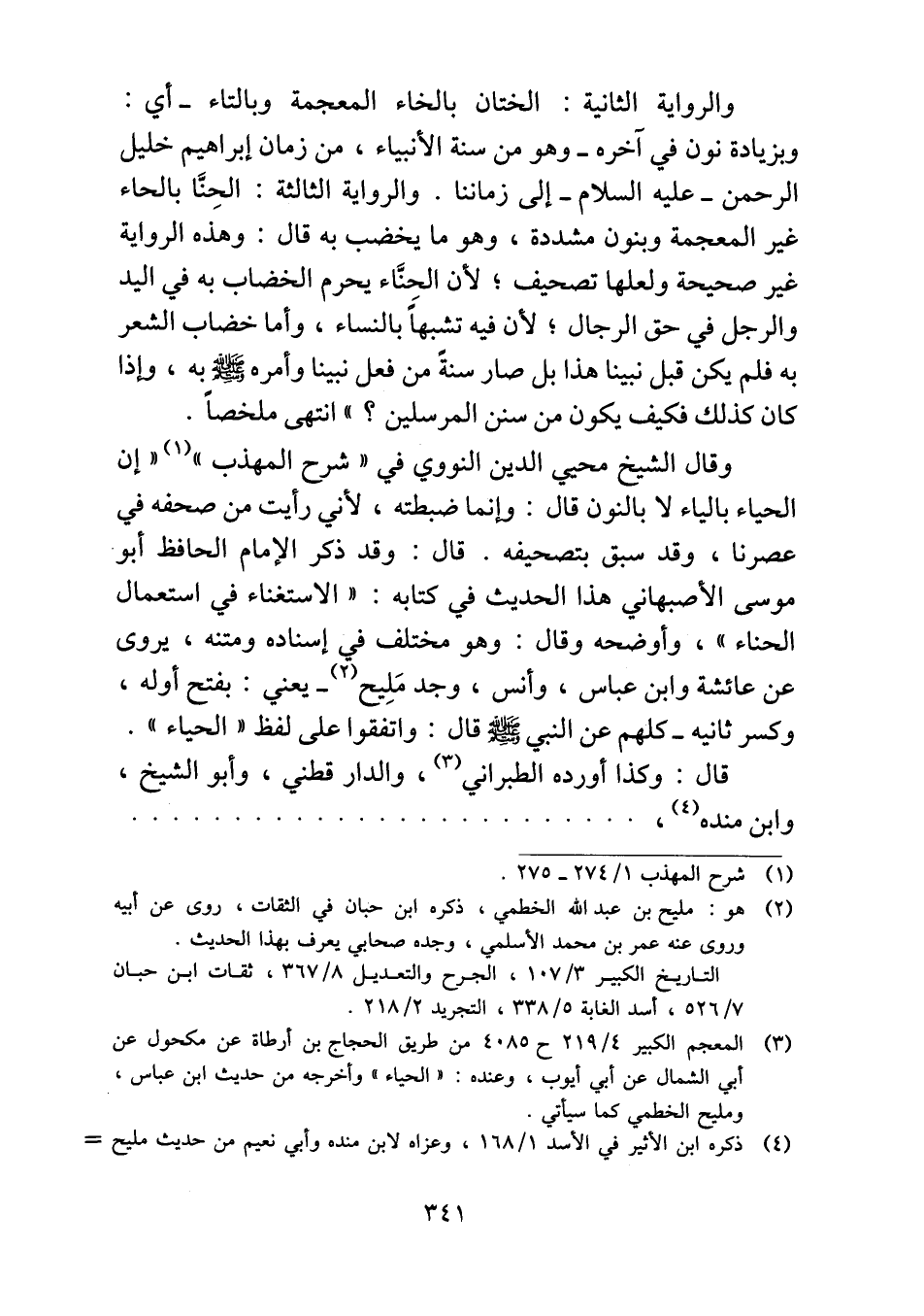 وقال الشيخ محيي الدين النووي في "شرح المهذب" (١) "إن الحياء بالياء لا بالنون قال: وإنما ضبطته، لأني رأيت من صحفه في عصرنا، وقد سبق بتصحيفه. قال: وقد ذكر الإمام الحافظ أبو موسى الأصبهاني هذا الحديث في كتابه: "الاستغناء في استعمال الحناء"، وأوضحه وقال: وهو مختلف في إسناده ومتنه، يروى عن عائشة وابن عباس، وأنس، وجد مَلِيح (٢) -يعني: بفتح أوله، وكسر ثانيه- كلهم عن النبي -صلى الله عليه وسلم- قال: واتفقوا على لفظ "الحياء".
