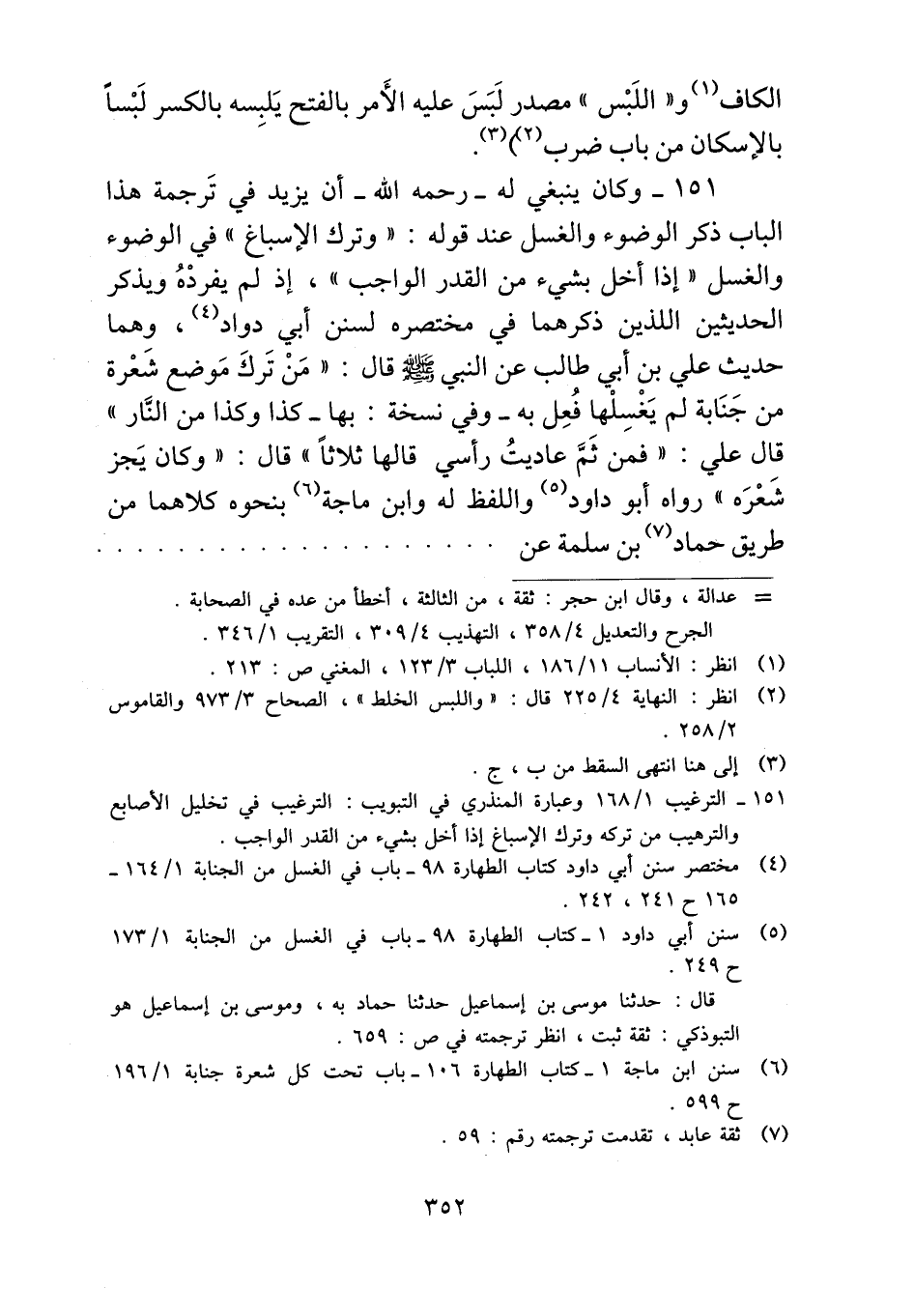 ١٥١ - وكان ينبغي له -رحمه الله- أن يزيد في تَرجمة هذا الباب ذكر الوضوء والغسل عند قوله: "وترك الإسباغ" في الوضوء والغسل "إذا أخل بشيء من القدر الواجب"، إذ لم يفردْهُ ويذكر الحديثين اللذين ذكرهما في مختصره لسنن أبي دواد، وهما حديث علي بن أبي طالب عن النبي -صلى الله عليه وسلم- قال: "مَنْ تَركَ مَوضع شَعْرة من جَنَابة لم يَغْسِلْها فُعِل به -وفي نسخة: بها- كذا وكذا من النَّار" قال علي: "فمن ثَمَّ عاديتُ رأسي قالها ثلاثاً" قال: "وكان يَجز شَعْرَه" رواه أبو داود واللفظ له وابن ماجة بنحوه كلاهما من طريق حماد بن سلمة عن