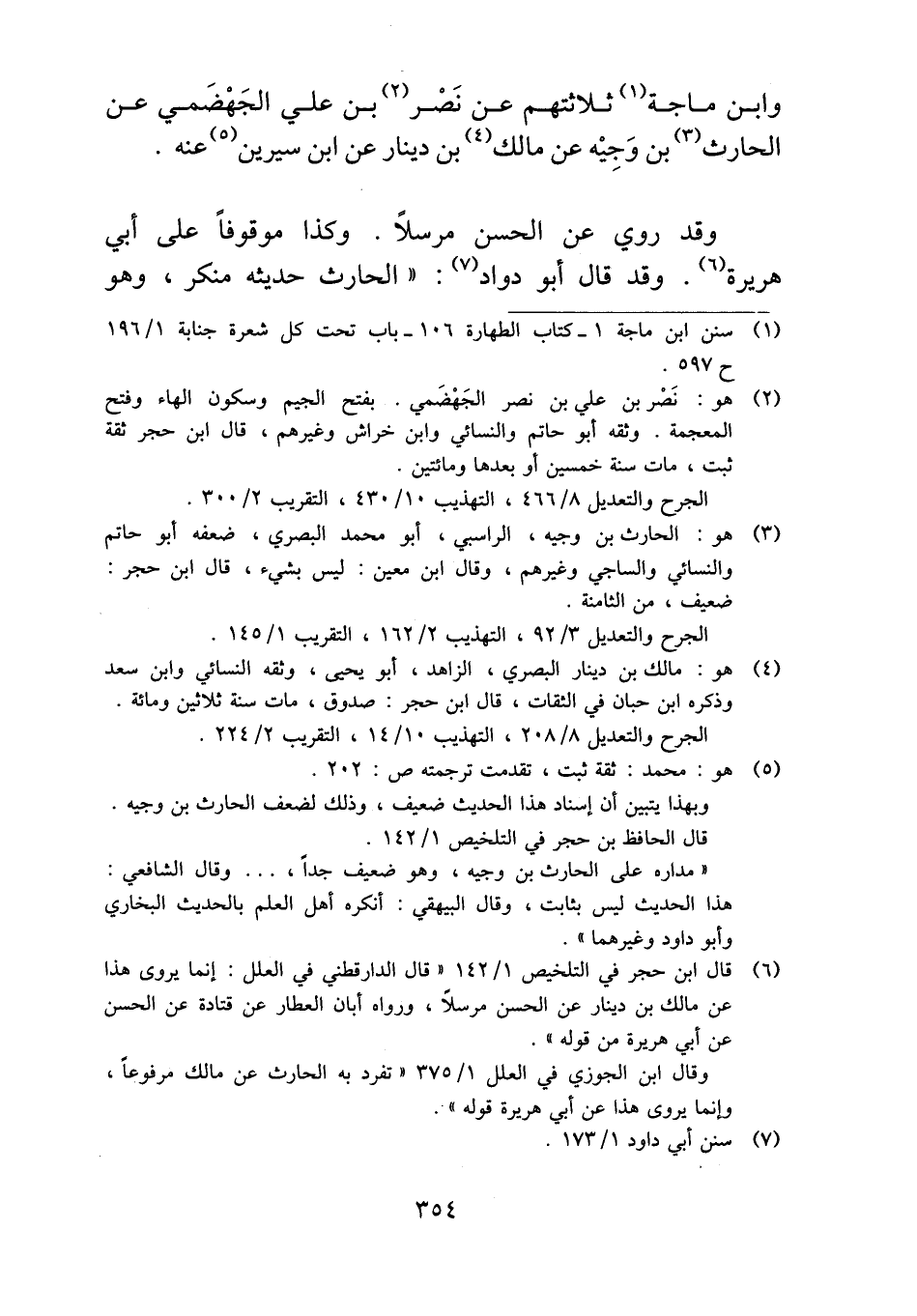 وابن ماجة ثلاثتهم عن نَصْر بن علي الجَهْضَمي عن الحارث بن وَجِيْه عن مالك بن دينار عن ابن سيرين عنه.