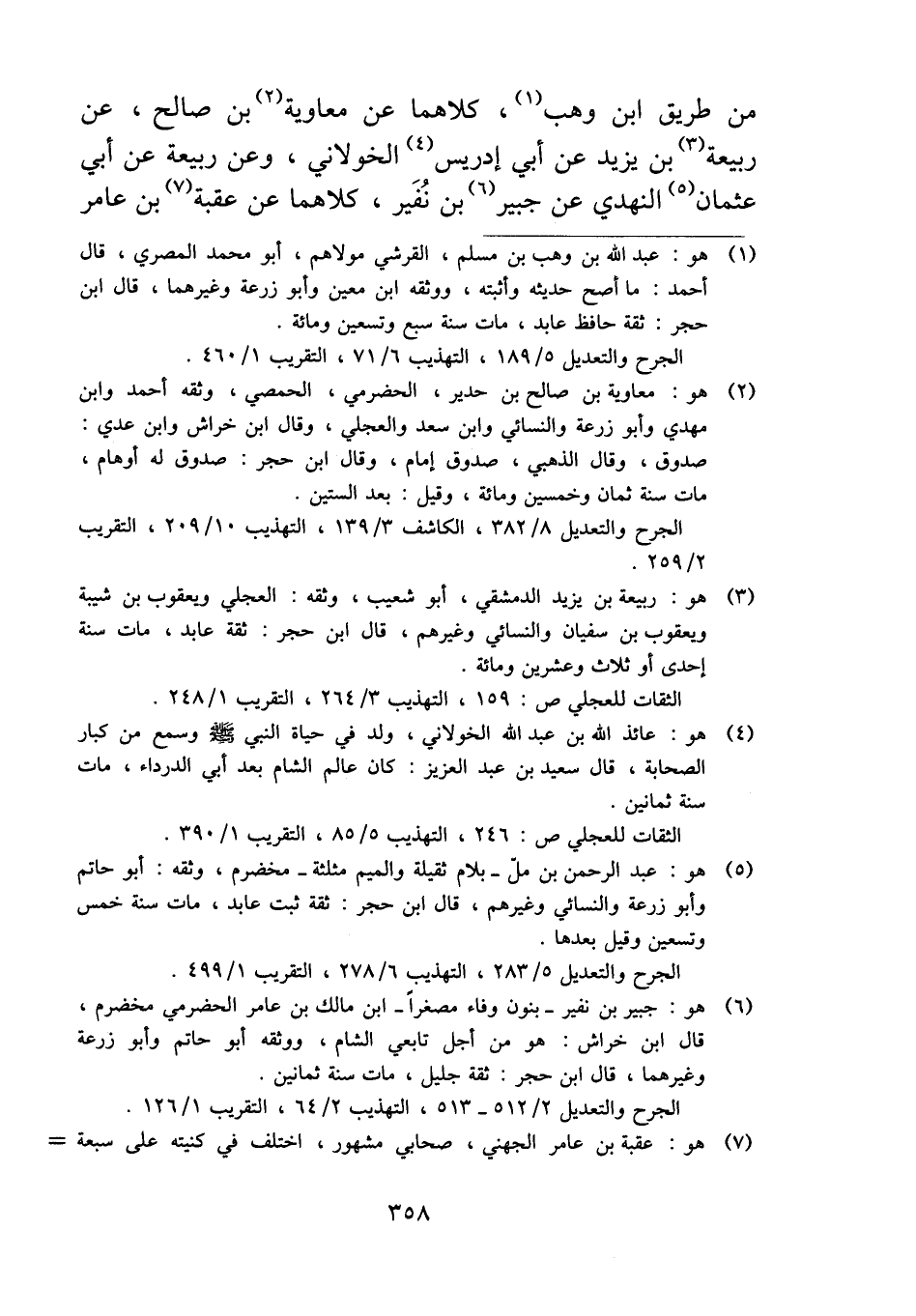 من طريق ابن وهب، كلاهما عن معاوية بن صالح، عن ربيعة بن يزيد عن أبي إدريس الخولاني، وعن ربيعة عن أبي عثمان النهدي عن جبير بن نُفَير، كلاهما عن عقبة بن عامر