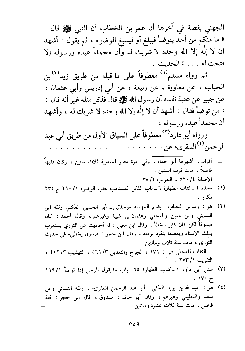 الجهني بقصة في آخرها أن عمر بن الخطاب أن النبي - صلى الله عليه وسلم - قال: "ما منكم من أحد يتوضأ فيبلغ أو فيسبغ الوضوء، ثم يقول: أشهد أن لا إله إلا الله وحده لا شريك له وأن محمداً عبده ورسوله إلا فتحت له ... " الحديث.