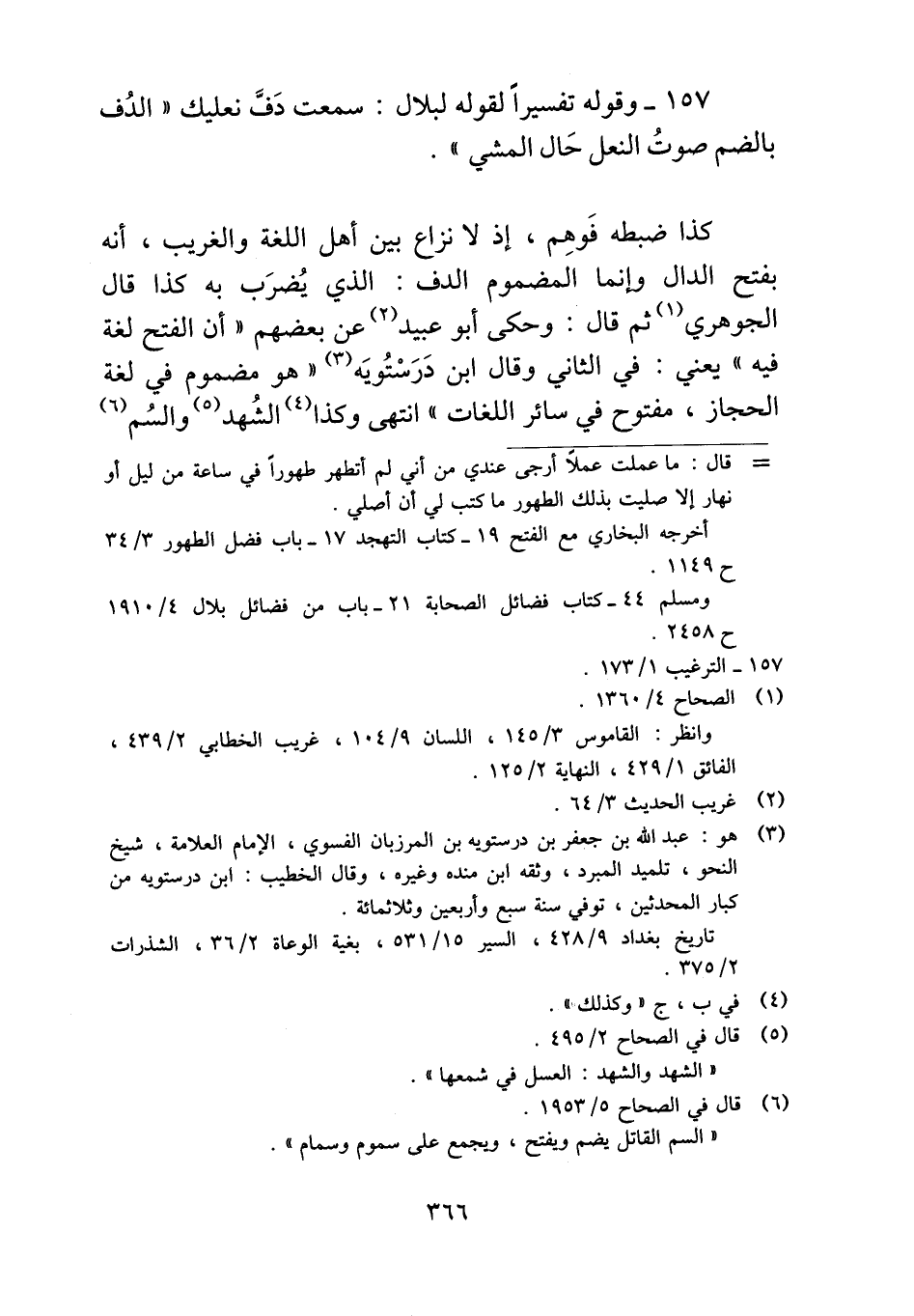 ١٥٧ - وقوله تفسيراً لقوله لبلال: سمعت دَفَّ نعليك "الدُف بالضم صوتُ النعل حَال المشي".