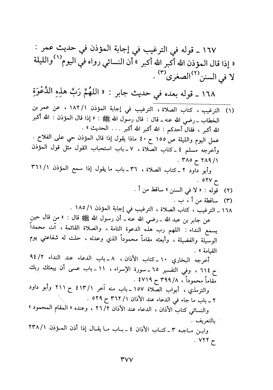 ١٦٧ - قوله في الترغيب في إجابة المؤذن في حديث عمر: