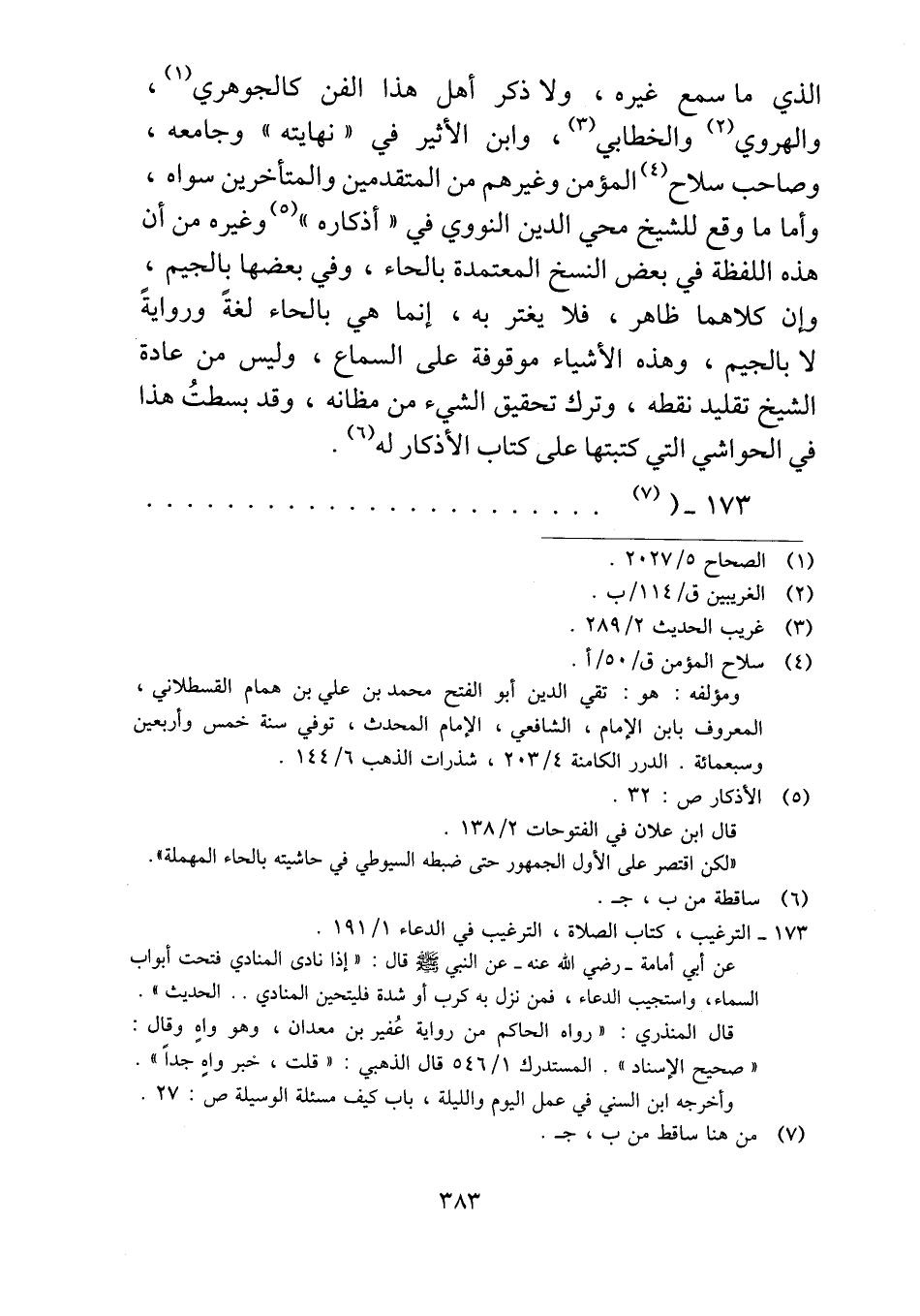 الذي ما سمع غيره، ولا ذكر أهل هذا الفن كالجوهري، والهروي والخطابي، وابن الأثير في "نهايته" وجامعه، وصاحب سلاح المؤمن وغيرهم من المتقدمين والمتأخرين سواه، وأما ما وقع للشيخ محيي الدين النووي في "أذكاره" وغيره من أن هذه اللفظة في بعض النسخ المعتمدة بالحاء، وفي بعضها بالجيم، وإن كلاهما ظاهر، فلا يغتر به، إنما هي بالحاء لغةً وروايةً لا بالجيم، وهذه الأشياء موقوفة على السماع، وليس من عادة الشيخ تقليد نقطه، وترك تحقيق الشيء من مظانه، وقد بسطتُ هذا في الحواشي التي كتبتها على كتاب الأذكار له.