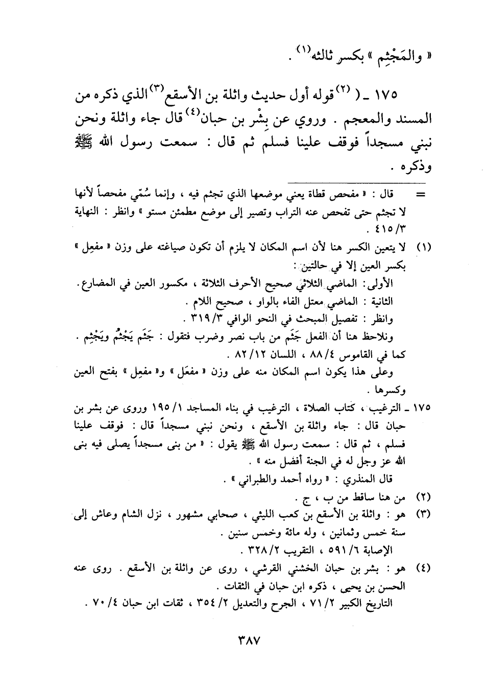 ١٧٥ - (قوله أول حديث واثلة بن الأسقع الذي ذكره من المسند والمعجم. وروي عن بِشْر بن حبان قال جاء واثلة ونحن نبني مسجداً فوقف علينا فسلم ثم قال: سمعت رسول الله -صلى الله عليه وسلم- وذكره.