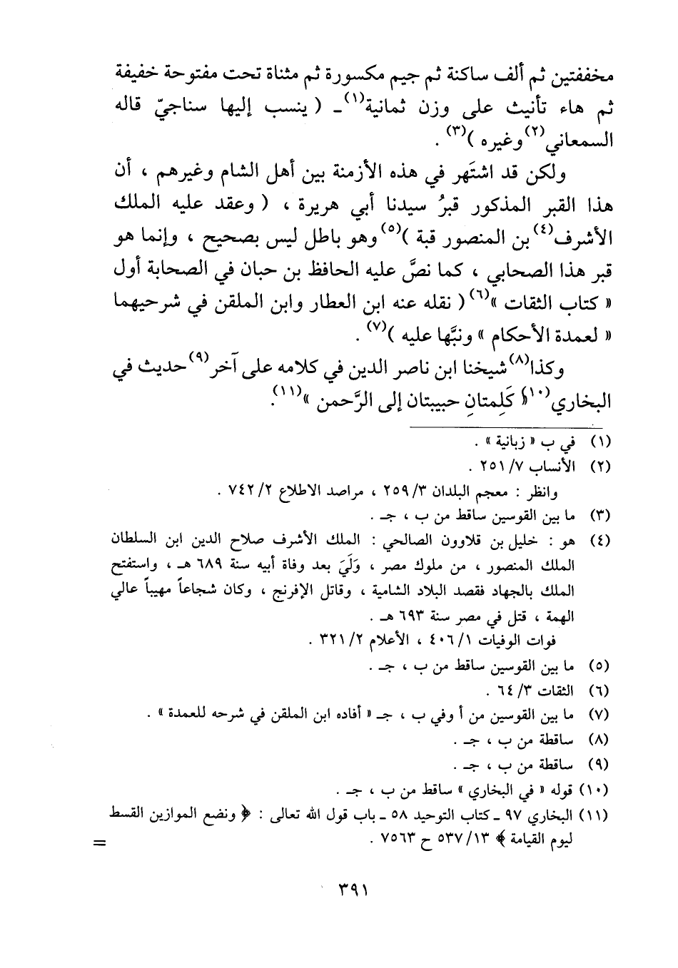 ولكن قد اشتَهر في هذه الأزمنة بين أهل الشام وغيرهم، أن هذا القبر المذكور قبرُ سيدنا أبي هريرة، (وعقد عليه الملك الأشرف بن المنصور قبة) وهو باطل ليس بصحيح، وإنما هو قبر هذا الصحابي، كما نصَّ عليه الحافظ بن حبان في الصحابة أول "كتاب الثقات" (نقله عنه ابن العطار وابن الملقن في شرحيهما "لعمدة الأحكام" ونبَّها عليه).