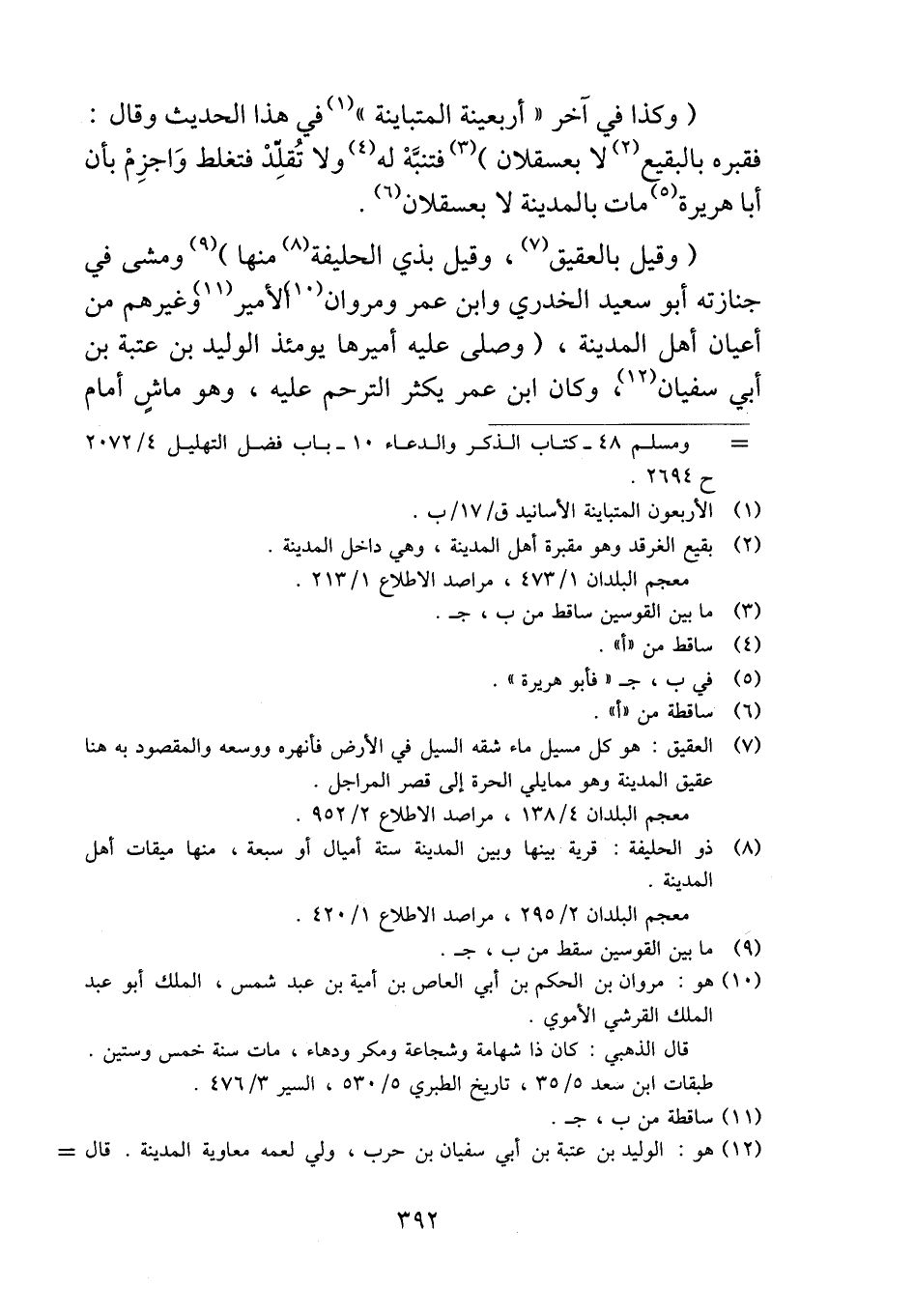 (وكذا في آخر "أربعينة المتباينة" في هذا الحديث وقال: فقبره بالبقيع لا بعسقلان) فتنبَّهْ له ولا تُقلِّد فتغلط وَاجزِمْ بأن أبا هريرة مات بالمدينة لا بعسقلان.