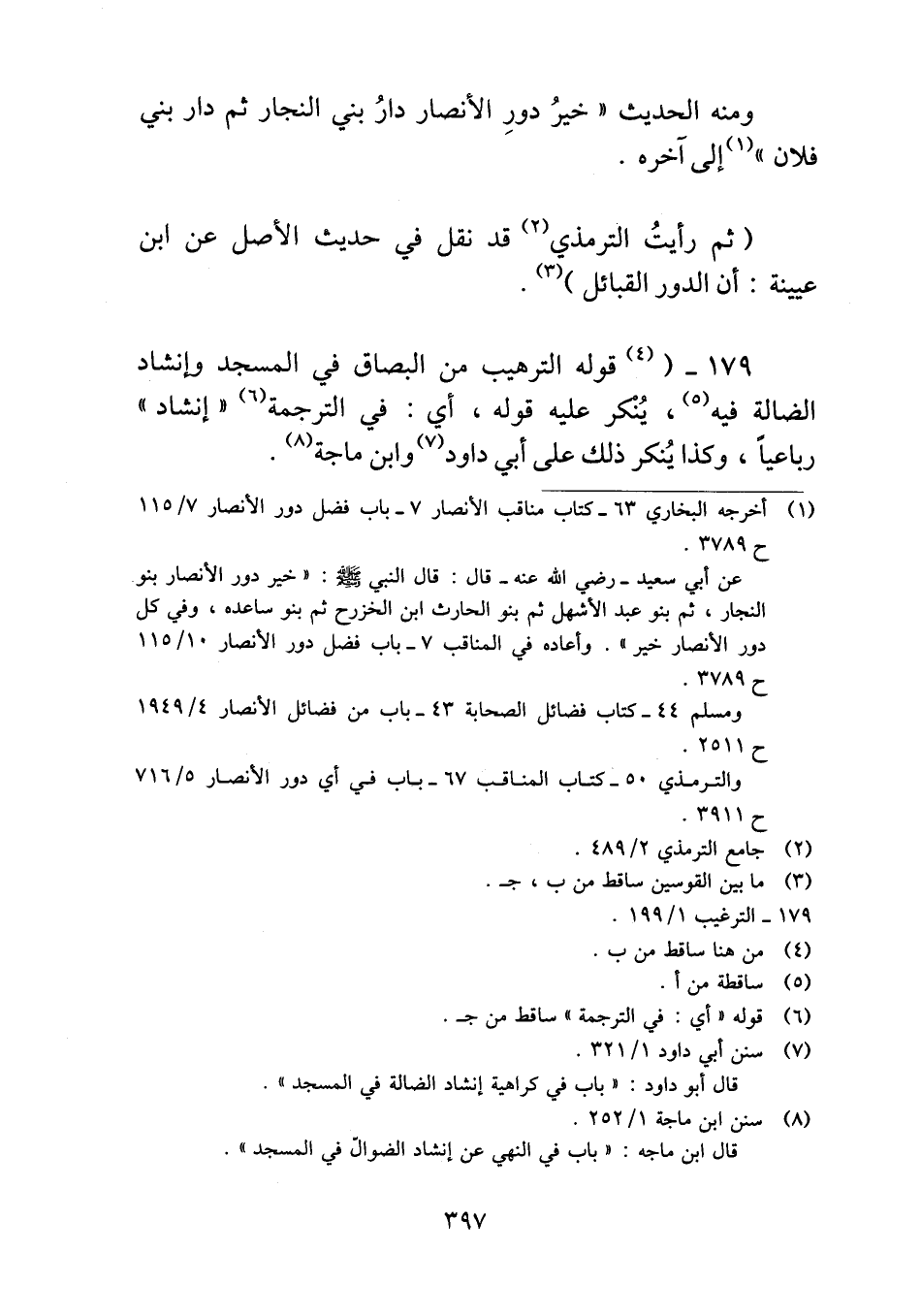 ١٧٩ - (قوله الترهيب من البصاق في المسجد وإنشاد الضالة فيه، يُنكر عليه قوله، أي: في الترجمة "إنشاد" رباعياً، وكذا يُنكر ذلك على أبي داود وابن ماجة.