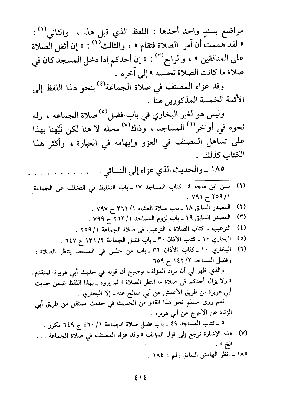 وقد عزاه المصنف في صلاة الجماعة بنحو هذا اللفظ إلى الأئمة الخمسة المذكورين هنا.