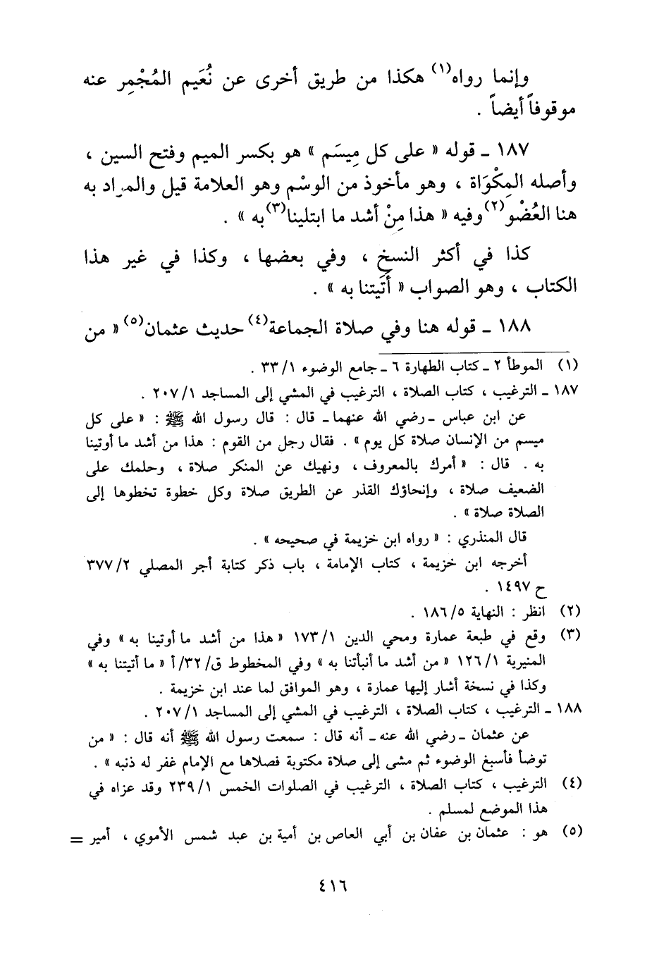 ١٨٨ - قوله هنا وفي صلاة الجماعة حديث عثمان "من
