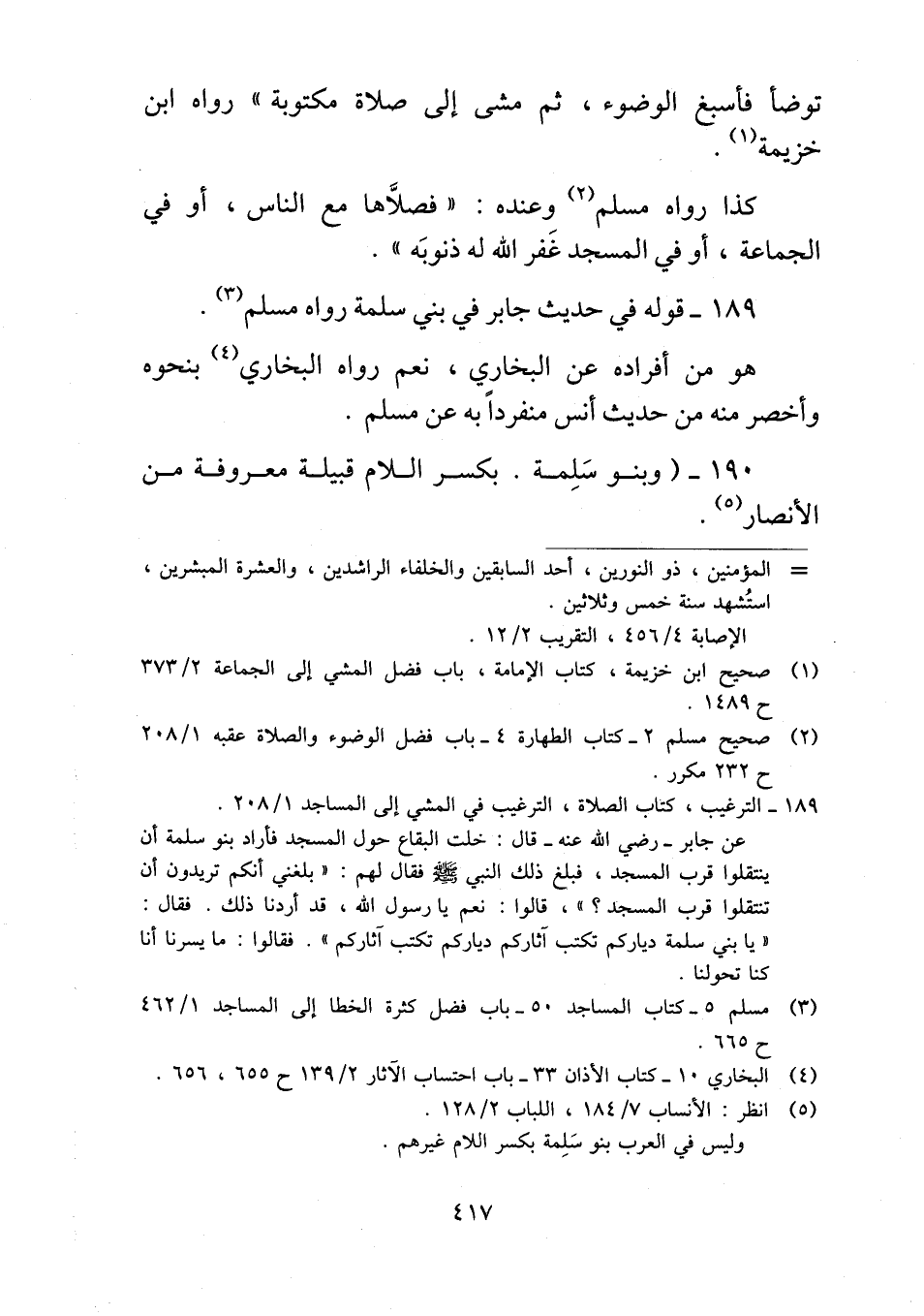 ١٨٩ - قوله في حديث جابر في بني سلمة رواه مسلم.