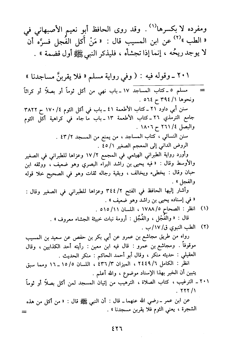 ٢٠١ - وقوله فيه: (وفي رواية مسلم "فلا يقربنَّ مساجدنا"