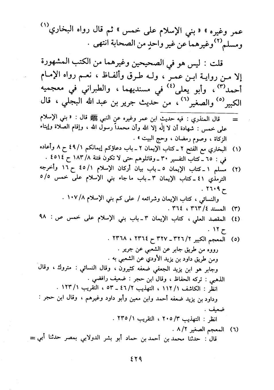 عمر وغيره" "بني الإسلام على خمس" ثم قال رواه البخاري ومسلم وغيرهما عن غير واحدٍ من الصحابة انتهى.