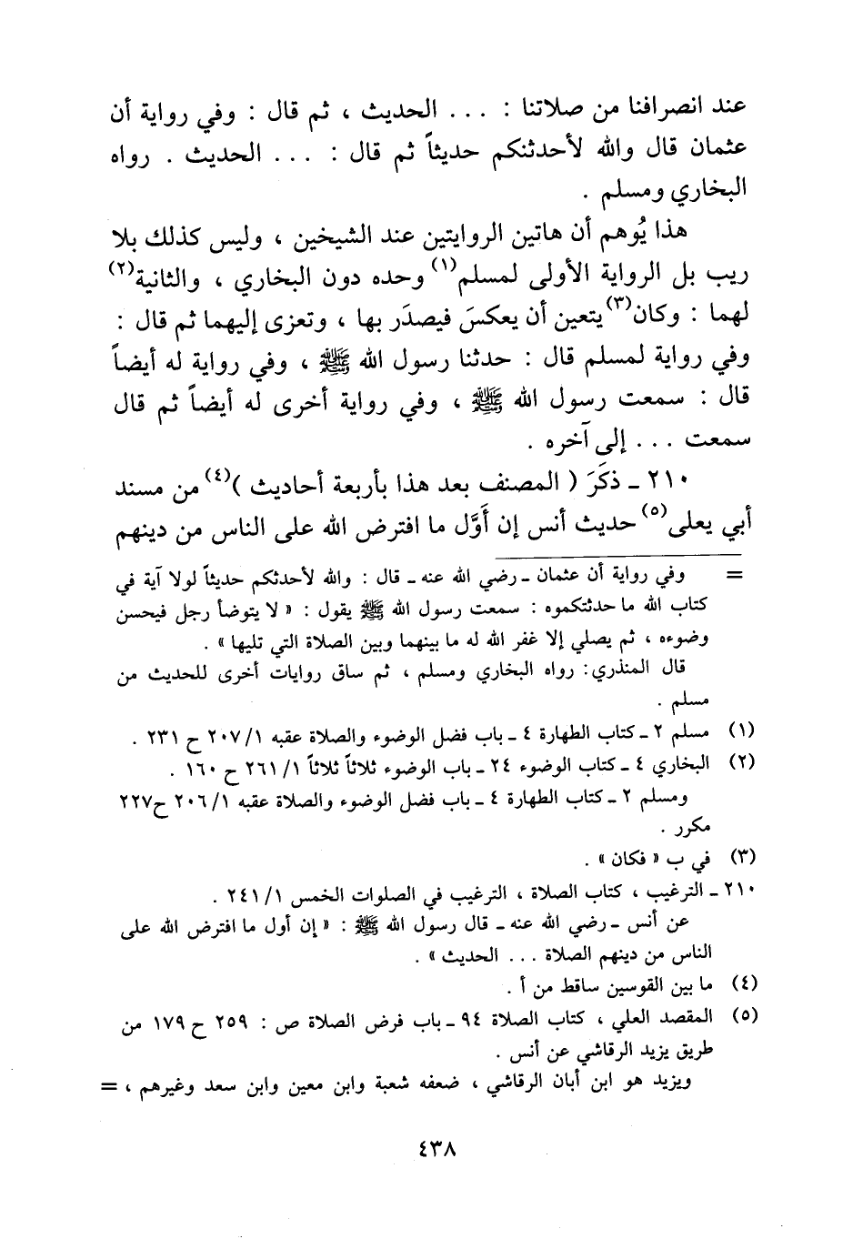 عند انصرافنا من صلاتنا: ... الحديث، ثم قال: وفي رواية أن عثمان قال والله لأحدثنكم حديثاً ثم قال: ... الحديث. رواه البخاري ومسلم.