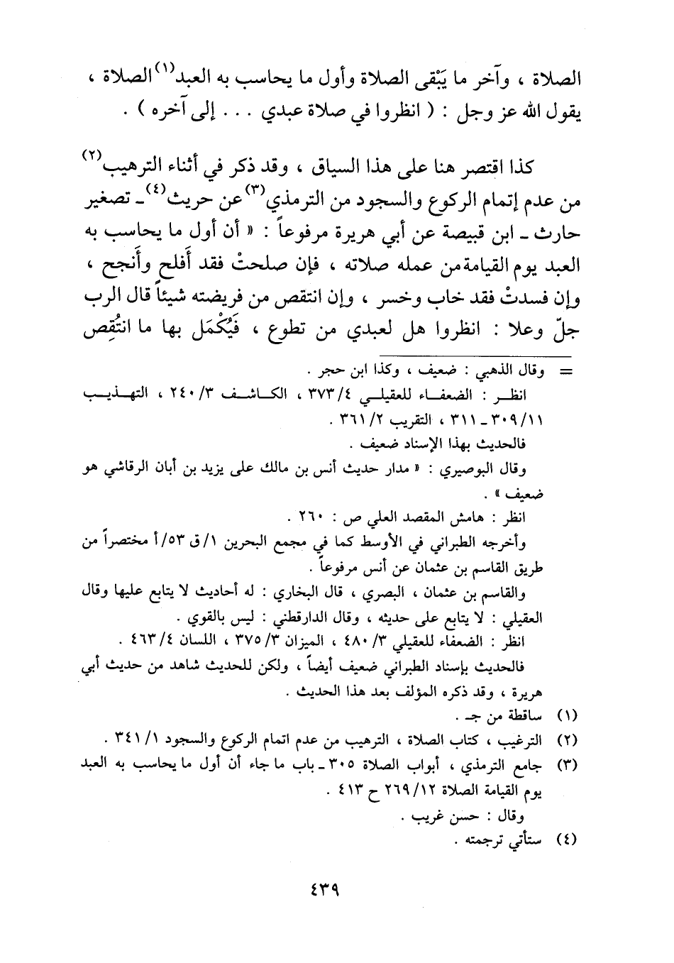 كذا اقتصر هنا على هذا السياق، وقد ذكر في أثناء الترهيب من عدم إتمام الركوع والسجود من الترمذي عن حريث -تصغير حارث- ابن قبيصة عن أبي هريرة مرفوعاً: "أن أول ما يحاسب به العبد يوم القيامة من عمله صلاته، فإن صلحتْ فقد أَفلح وأَنجح، وإن فسدتْ فقد خاب وخسر، وإن انتقص من فريضته شيئاً قال الرب جلّ وعلا: انظروا هل لعبدي من تطوع، فَيُكْمَل بها ما انتُقِص