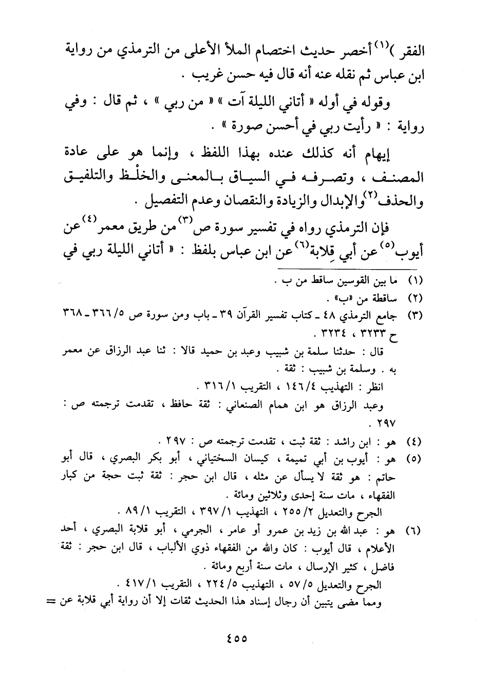 فإن الترمذي رواه في تفسير سورة ص من طريق معمر عن أيوب عن أبي قِلابة عن ابن عباس بلفظ: "أتاني الليلة ربي في