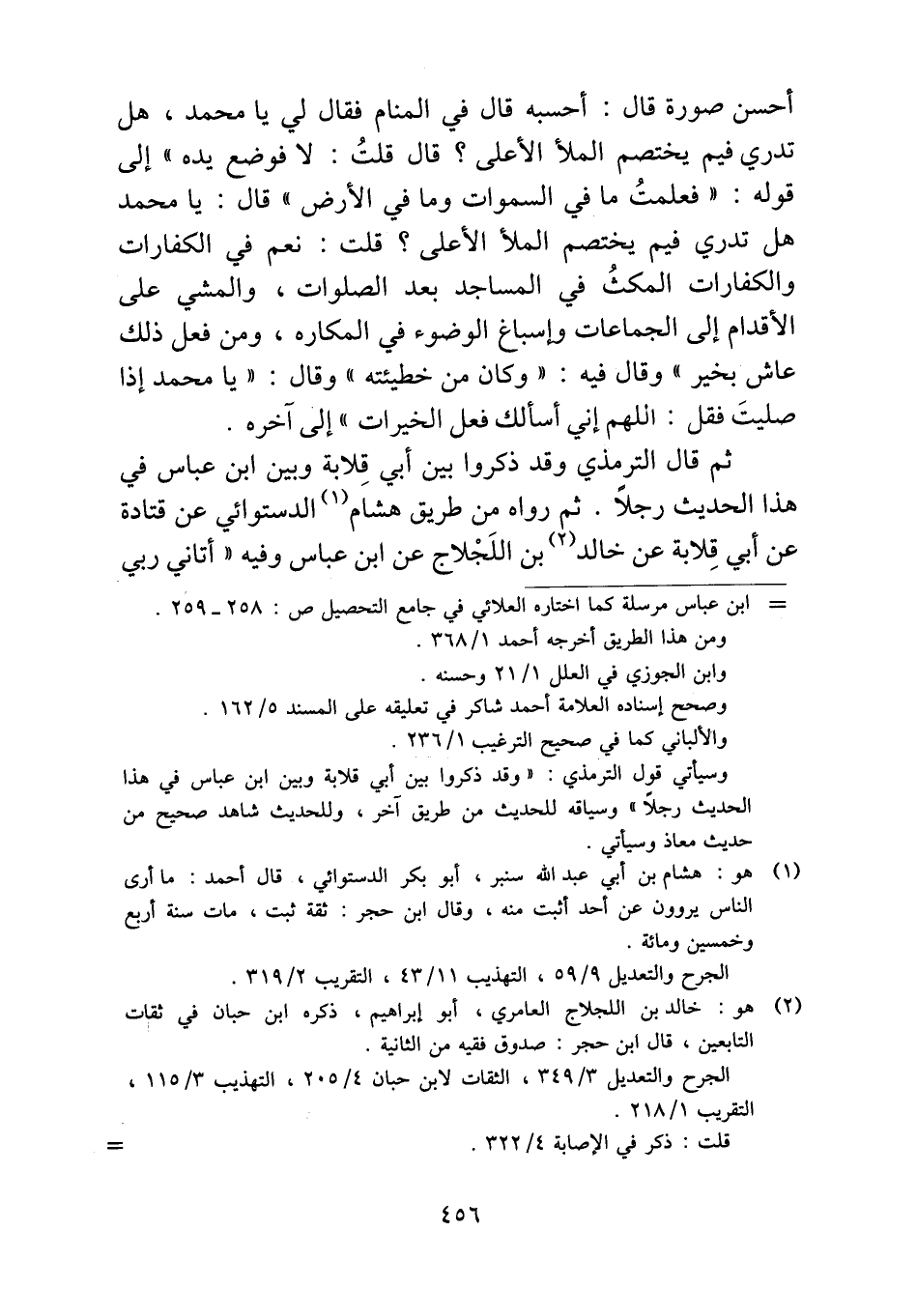 ثم قال الترمذي وقد ذكروا بين أبي قِلابة وبين ابن عباس في هذا الحديث رجلاً. ثم رواه من طريق هشام الدستوائي عن قتادة عن أبي قِلابة عن خالد بن اللَجْلاج عن ابن عباس وفيه "أتاني ربي