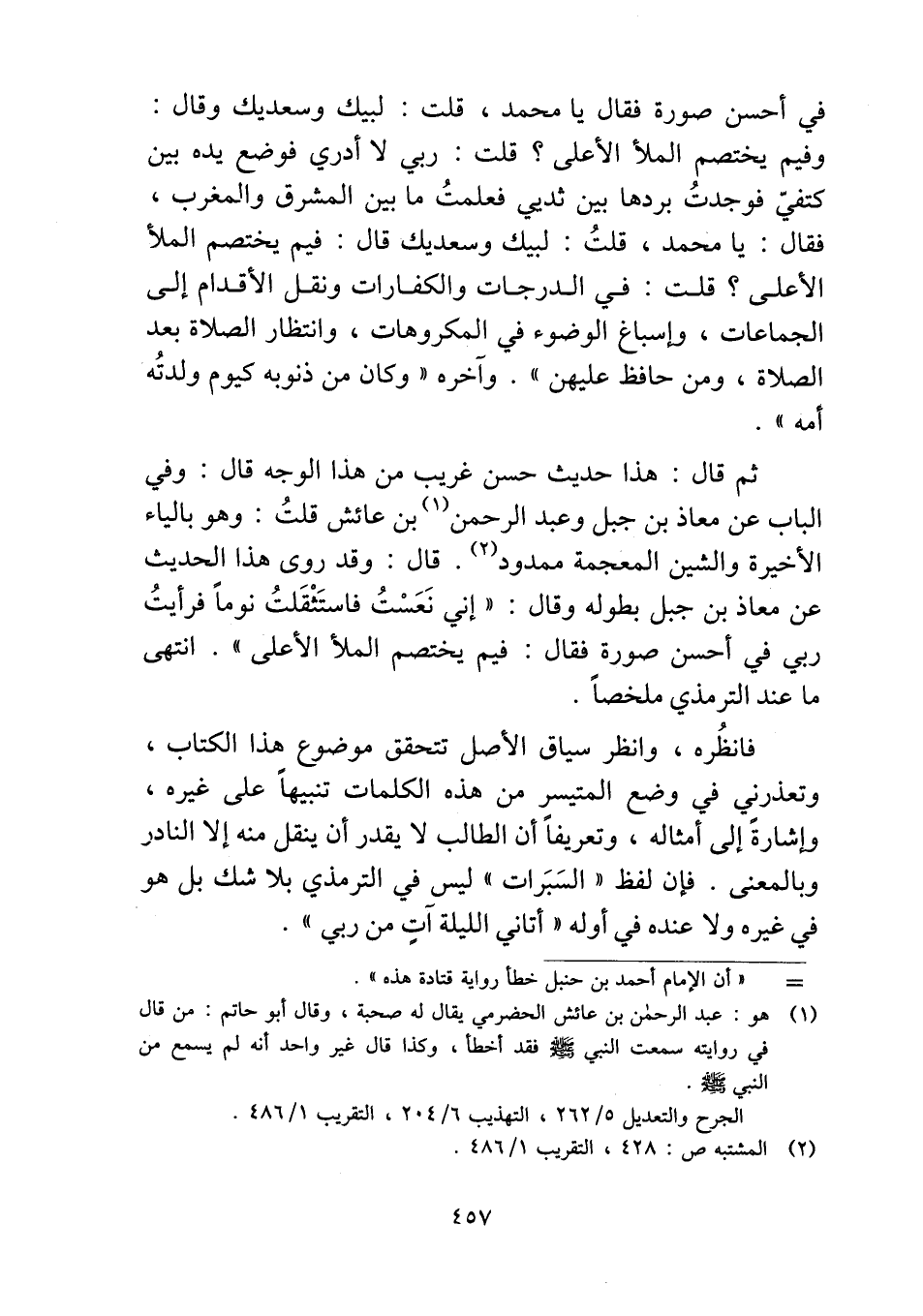 فانظُره، وانظر سياق الأصل تتحقق موضوع هذا الكتاب، وتعذرني في وضع المتيسر من هذه الكلمات تنبيهاً على غيره، وإشارةً إلى أمثاله، وتعريفاً أن الطالب لا يقدر أن ينقل منه إلا النادر وبالمعنى. فإن لفظ "السَبَرات" ليس في الترمذي بلا شك بل هو في غيره ولا عنده في أوله "أتاني الليلة آتٍ من ربي".