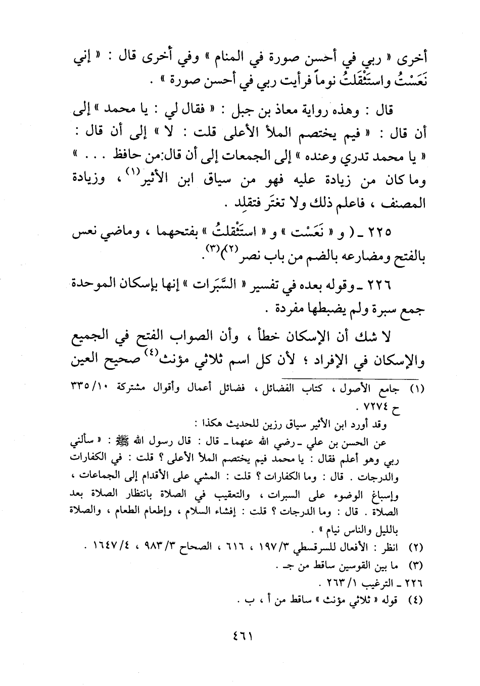 قال: وهذه رواية معاذ بن جبل: "فقال لي: يا محمد" إلى أن قال: "فيم يختصم الملأ الأعلى قلت: لا" إلى أن قال: "يا محمد تدري وعنده" إلى الجمعات إلى أن قال: من حافظ ... " وما كان من زيادة عليه فهو من سياق ابن الأثير، وزيادة المصنف، فاعلم ذلك ولا تغتَر فتقلِد.