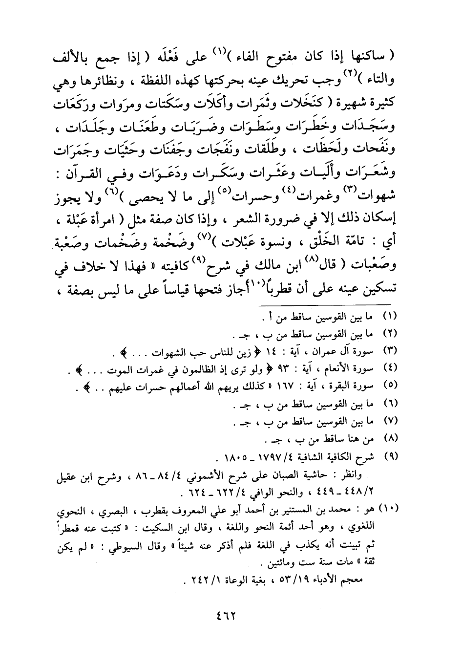 (ساكنها إذا كان مفتوح الفاء) على فَعْلَه (إذا جمع بالألف والتاء) وجب تحريك عينه بحركتها كهذه اللفظة، ونظائرها وهي كثيرة شهيرة (كنَخَلات وثَمَرات وأكَلاَت وسَكَتات ومرَوات ورَكَعَات وسَجَدَات وخَطَرَات وسَطَوَات وضَرَبَات وطَعَنَات وجَلَدَات، ونَفَحات ولَحَظَات، وطَلَقات ونَفَجَات وجَفَنَات وحَثَيَات وجَمَرَات وشَعَرَات وأَلَيات وعَثَرات وسَكَرات ودَعَوَات وفي القرآن: شهوات وغمرات وحسرات إلى ما لا يحصى) ولا يجوز إسكان ذلك إلا في ضرورة الشعر، وإذا كان صفة مثل (امرأة عَبْلة، أي: تامّة الخَلْق، ونسوة عَبْلات) وضَخْمة وضَخْمات وصَعْبة وصَعْبات (قال ابن مالك في شرح كافيته "فهذا لا خلاف في تسكين عينه على أن قطربًا أجاز فتحها قياساً على ما ليس بصفة،