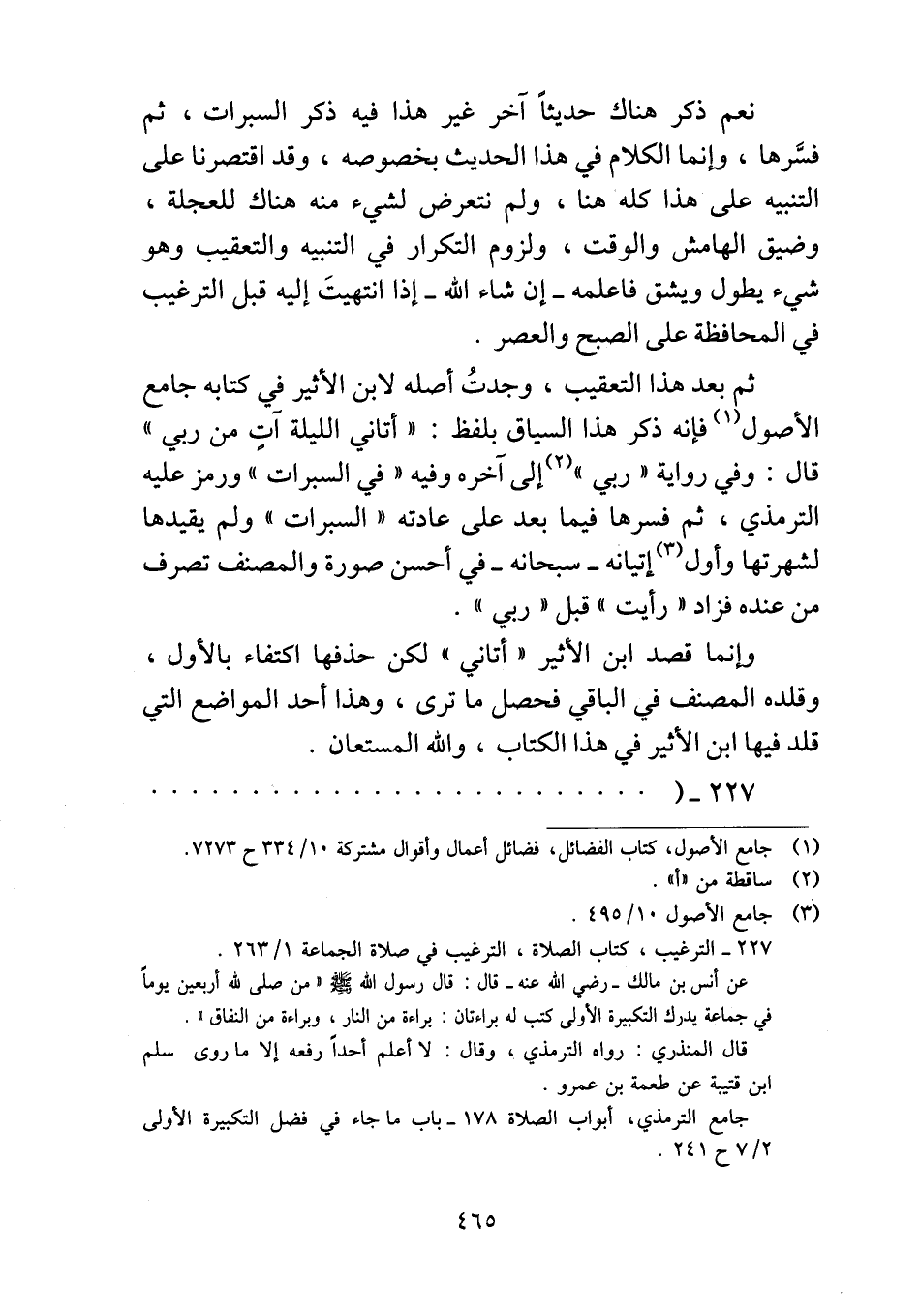 نعم ذكر هناك حديثاً آخر غير هذا فيه ذكر السبرات، ثم فسَّرها، وإنما الكلام في هذا الحديث بخصوصه، وقد اقتصرنا على التنبيه على هذا كله هنا، ولم نتعرض لشيء منه هناك للعجلة، وضيق الهامش والوقت، ولزوم التكرار في التنبيه والتعقيب وهو شيء يطول ويشق فاعلمه -إن شاء الله- إذا انتهيتَ إليه قبل الترغيب في المحافظة على الصبح والعصر.