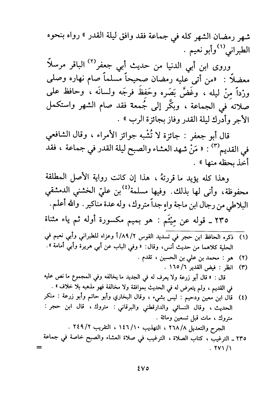 وروى ابن أبي الدنيا من حديث أبي جعفر الباقر مرسلاً معضلاً: "من أتى عليه رمضان صحيحاً مسلماً صام نهاره وصلى ورْداً مِنْ ليله، وغضَّ بَصَره وحَفِظَ فرجَه ولسانَه، وحافظ على صلاته في الجماعة، وبكَّر إلى جُمعة فقد صام الشهر واستكمل الأجر وأدرك ليلة القدر وفاز بجائزة الرب".