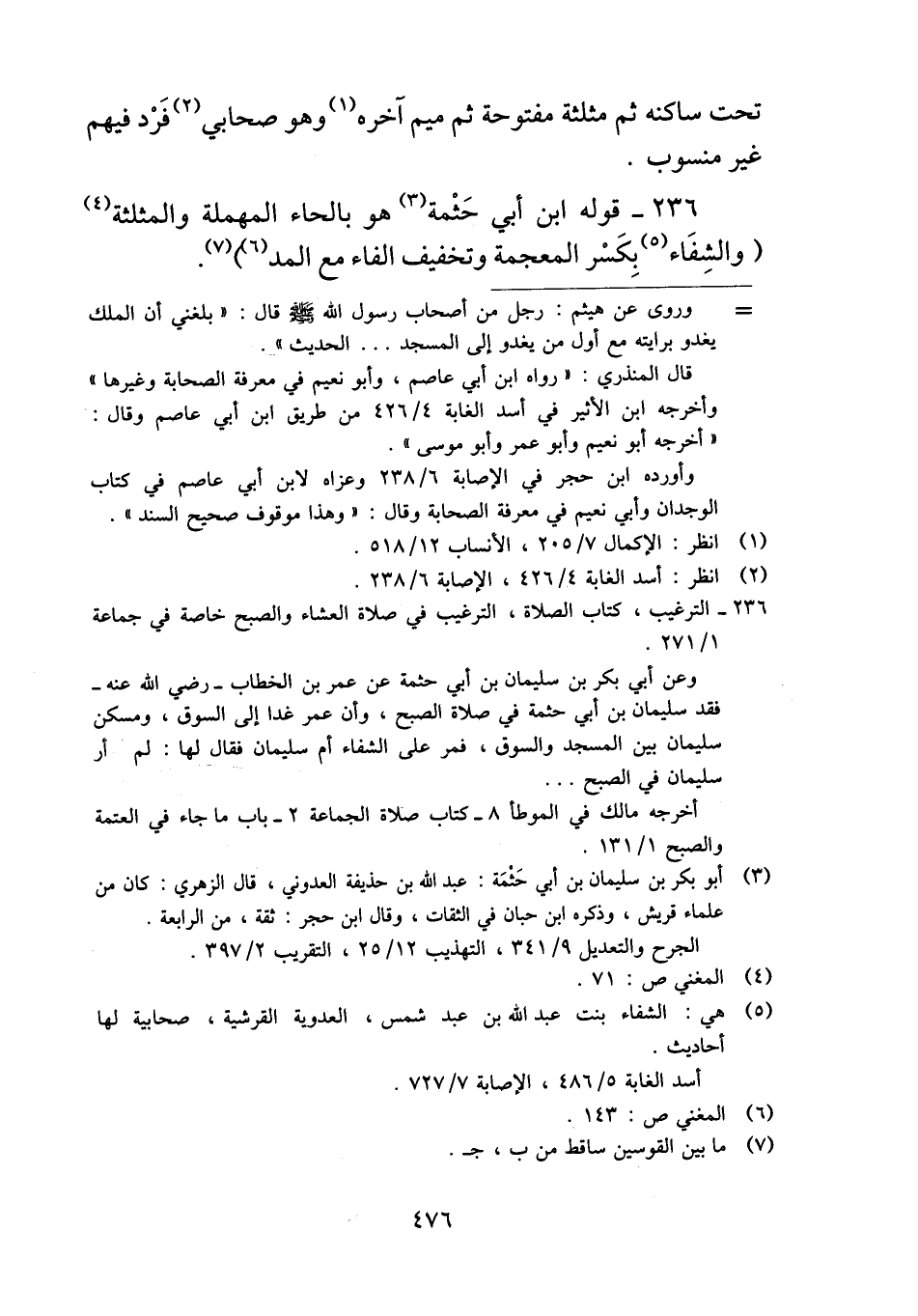 ٢٣٦ - قوله ابن أبي حَثْمة هو بالحاء المهملة والمثلثة (والشِفَاء بِكَسْر المعجمة وتخفيف الفاء مع المد).