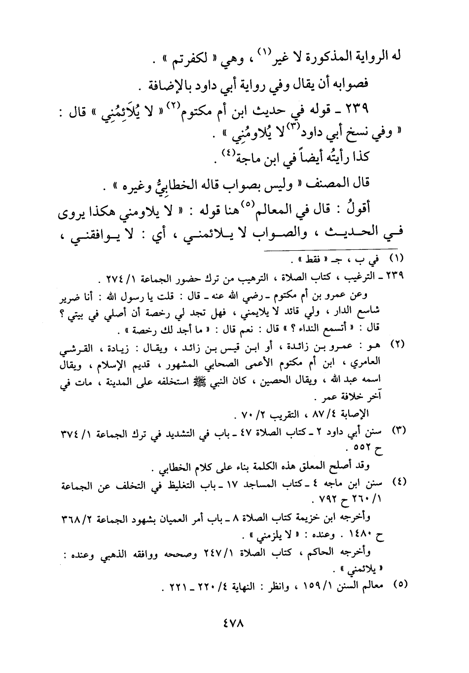 ٢٣٩ - قوله في حديث ابن أم مكتوم "لا يُلاَئِمُنِي" قال: "وفي نسخ أبي داود لا يُلاومُنِي".