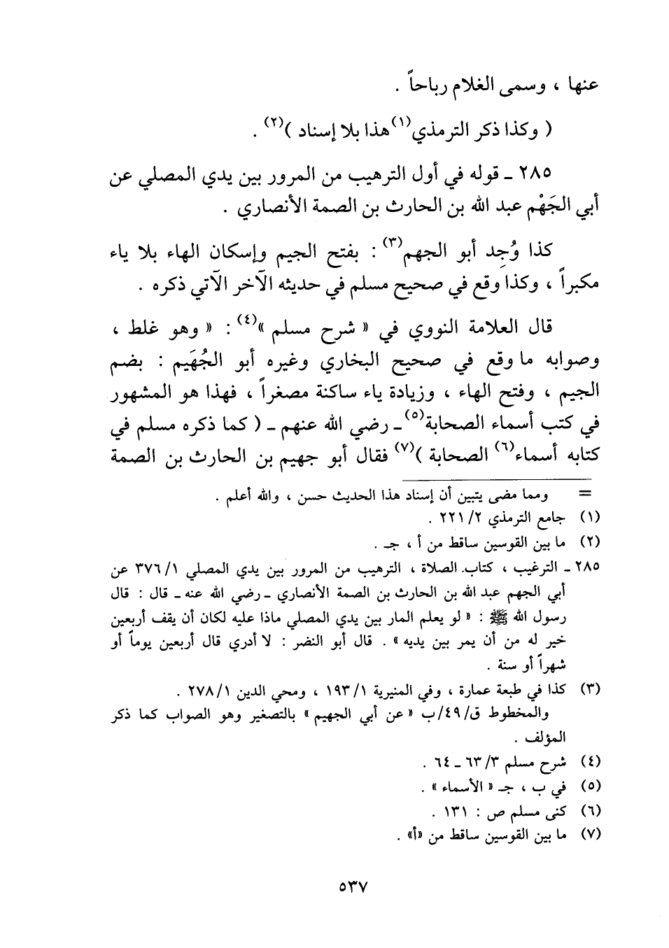 ٢٨٥ - قوله في أول الترهيب من المرور بين يدي المصلي عن أبي الجَهْم عبد الله بن الحارث بن الصمة الأنصاري.