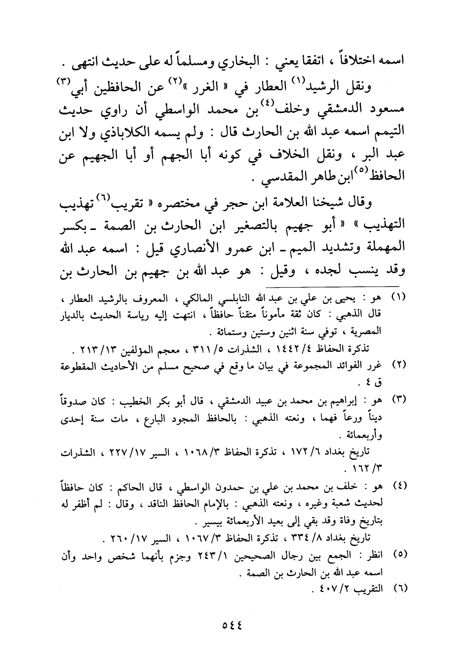 وقال شيخنا العلامة ابن حجر في مختصره "تقريب تهذيب التهذيب" "أبو جهيم بالتصغير ابن الحارث بن الصمة -بكسر المهملة وتشديد الميم- ابن عمرو الأنصاري قيل: اسمه عبد الله وقد ينسب لجده، وقيل: هو عبد الله بن جهيم بن الحارث بن