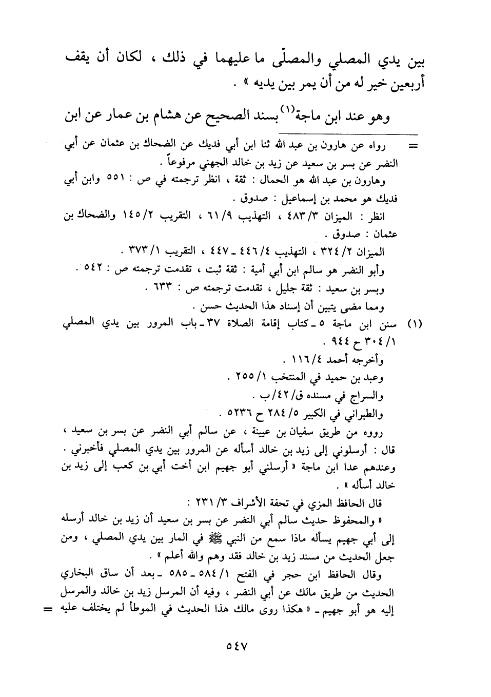 بين يدي المصلي والمصلّى ما عليهما في ذلك، لكان أن يقف أربعين خير له من أن يمر بين يديه".