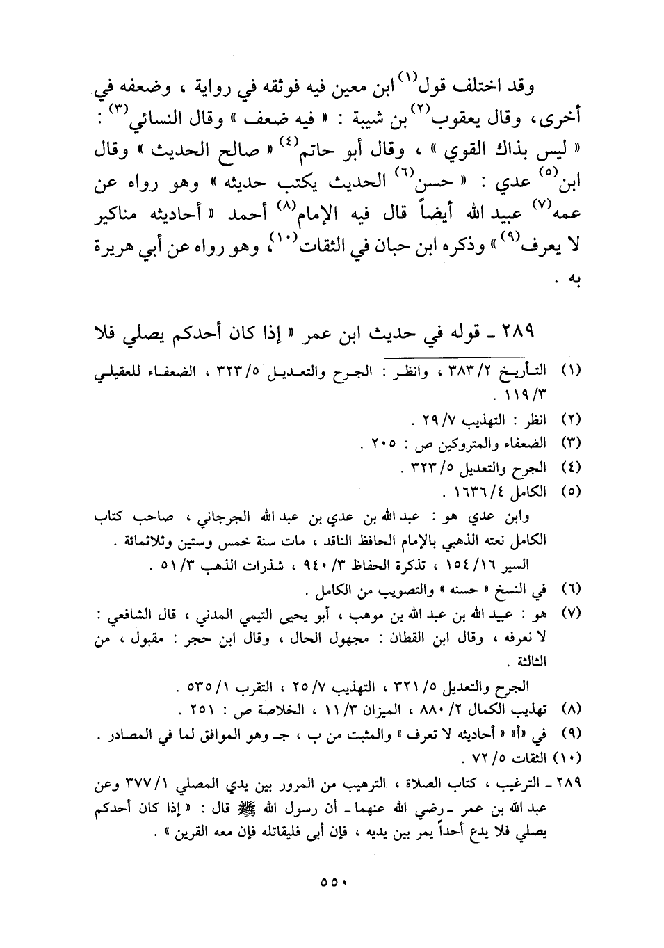 ٢٨٩ - قوله في حديث ابن عمر "إذا كان أحدكم يصلي فلا