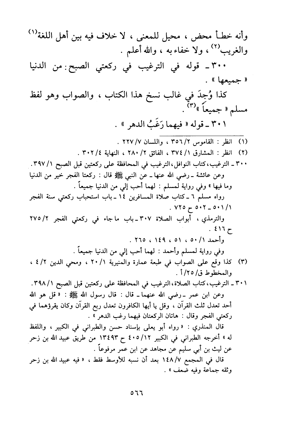 ٣٠٠ - قوله في الترغيب في ركعتي الصبح: من الدنيا "جميعها".