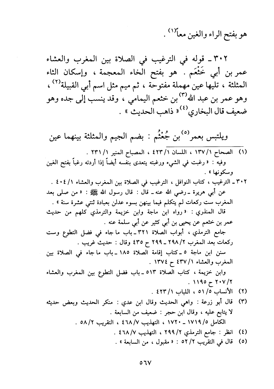 ٣٠٢ - قوله في الترغيب في الصلاة بين المغرب والعشاء عمر بن أبي خَثْعَم. هو بفتح الخاء المعجمة، وإسكان الثاء المثلثة، تليها عين مهملة مفتوحة، ثم ميم مثل اسم أبي القبيلة، وهو عمر بن عبد الله بن خثعم اليمامي، وقد ينسب إلى جده وهو ضعيف قال البخاري "ذاهب الحديث".