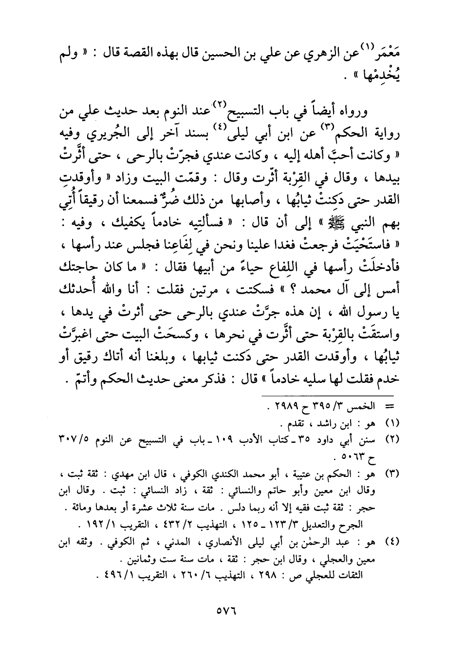 ورواه أيضاً في باب التسبيح عند النوم بعد حديث علي من رواية الحكم عن ابن أبي ليلى بسند آخر إلى الجُريري وفيه "وكانت أحبَّ أهله إليه، وكانت عندي فجرّتْ بالرحى، حتى أثَّرتْ بيدها، وقال في القِرْبة أثّرت وقال: وقمّت البيت وزاد "وأوقدتِ القدر حتى دَكِنتْ ثيابُها، وأصابها من ذلك ضُرٌّ فسمعنا أن رقيقاً أُتِي بهم النبي - صلى الله عليه وسلم-" إلى أن قال: "فسألتِيه خادماً يكفيك، وفيه: "فاستَحْيَتْ فرجتْ فغدا علينا ونحن في لِفَاعِنا فجلس عند رأسها، فأدخلَتْ رأسها في اللِفاع حياءً من أبيها فقال: "ما كان حاجتك أمس إلى آل محمد؟ " فسكتت، مرتين فقلت: أنا والله أُحدثك يا رسول الله، إن هذه جرَّتْ عندي بالرحى حتى أثرتْ في يدها، واستقَتْ بالقِرْبة حتى أثَّرت في نحرها، وكسحَتْ البيت حتى اغبرَّتْ ثيابُها، وأوقدت القدر حتى دَكنت ثيابها، وبلغنا أنه أتاك رقيق أو خدم فقلت لها سليه خادماً" قال: فذكر معنى حديث الحكم وأتمّ.